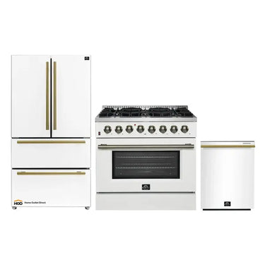 Forno Galiano 4-Piece Appliance Package - 36-Inch Gas Range, 36-Inch Hood, 36-Inch Refrigerator, & 24-Inch Dishwasher in White with Antique Brass Trim