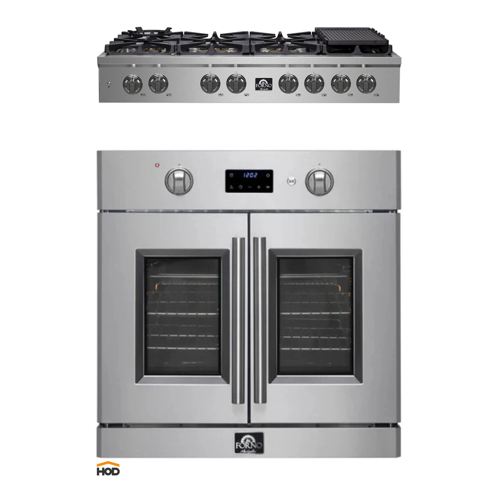 The FORNO ALTA QUALITA 48” Pro-Style Gas Rangetop has a versatile cooktop configuration with 8 sealed dual brass burners totalling 160,000 BTUs to handle any culinary challenge. Heavy duty continuous cast iron grates simplify moving pans around without lifting them off the surface and contoured Zinc Control Knobs allow easy control of the burners for precision gas cooking. Includes Auto-ignition, Griddle, Wok-Ring and LP conversion Kit. Heavy-duty 304 stainless steel cleans easily and beautifully complements other Forno appliances to fit any kitchen design.