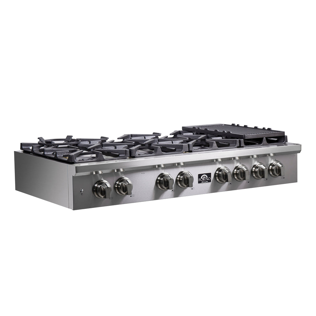 The FORNO ALTA QUALITA 48” Pro-Style Gas Rangetop has a versatile cooktop configuration with 8 sealed dual brass burners totalling 160,000 BTUs to handle any culinary challenge. Heavy duty continuous cast iron grates simplify moving pans around without lifting them off the surface and contoured Zinc Control Knobs allow easy control of the burners for precision gas cooking. Includes Auto-ignition, Griddle, Wok-Ring and LP conversion Kit. Heavy-duty 304 stainless steel cleans easily and beautifully complements other Forno appliances to fit any kitchen design.