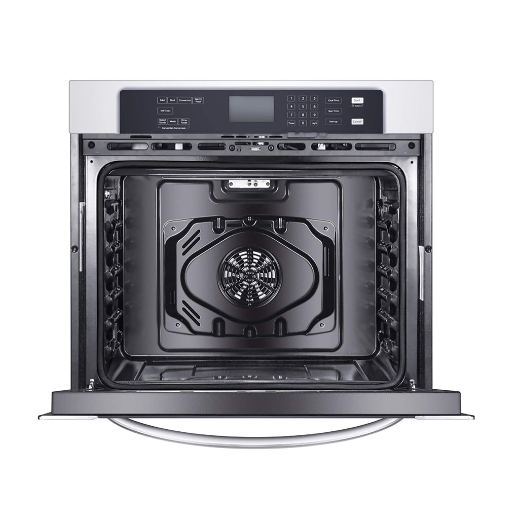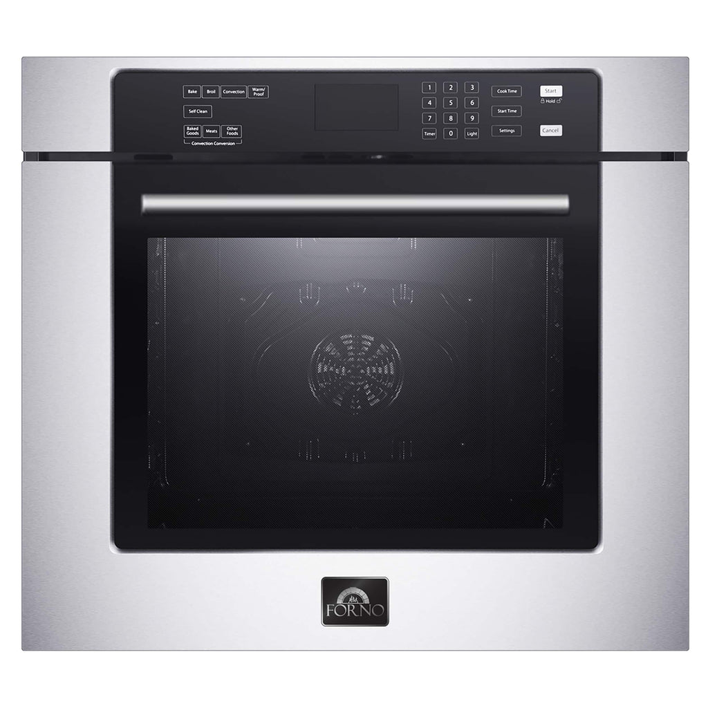 The Forno Villarosa 30 Inch electric wall oven has a capacity of 5 cu. ft. equipped with true european convection fans, maintaining a consistent uniformed oven temperature for evenly cooked meals. Touch controls and LCD display for air-fry function, bake, broil, roast, or warm/proof make it a truly versatile addition to your kitchen. Includes 2 electroplated racks and steam clean pan with delay start/self cleaning.