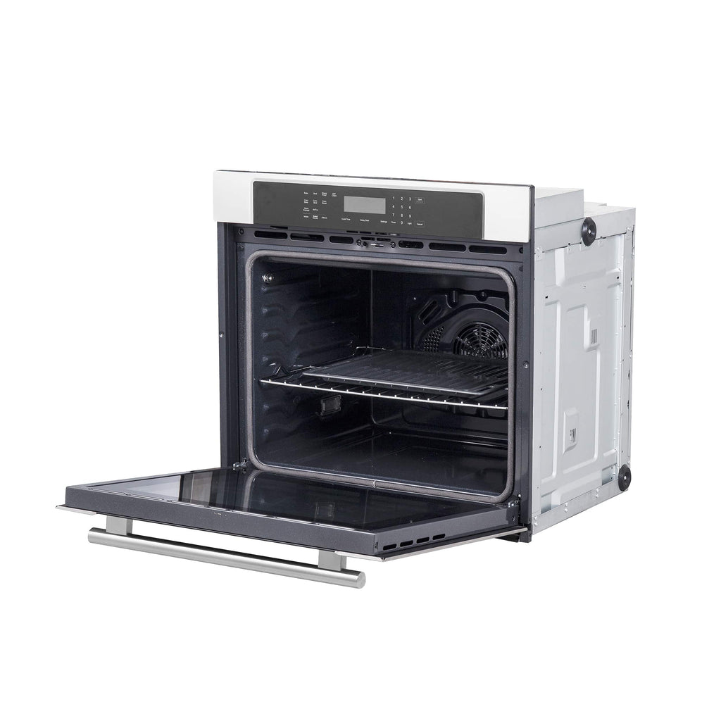 The Forno Villarosa 30 Inch electric wall oven has a capacity of 5 cu. ft. equipped with true european convection fans, maintaining a consistent uniformed oven temperature for evenly cooked meals. Touch controls and LCD display for air-fry function, bake, broil, roast, or warm/proof make it a truly versatile addition to your kitchen. Includes 2 electroplated racks and steam clean pan with delay start/self cleaning.