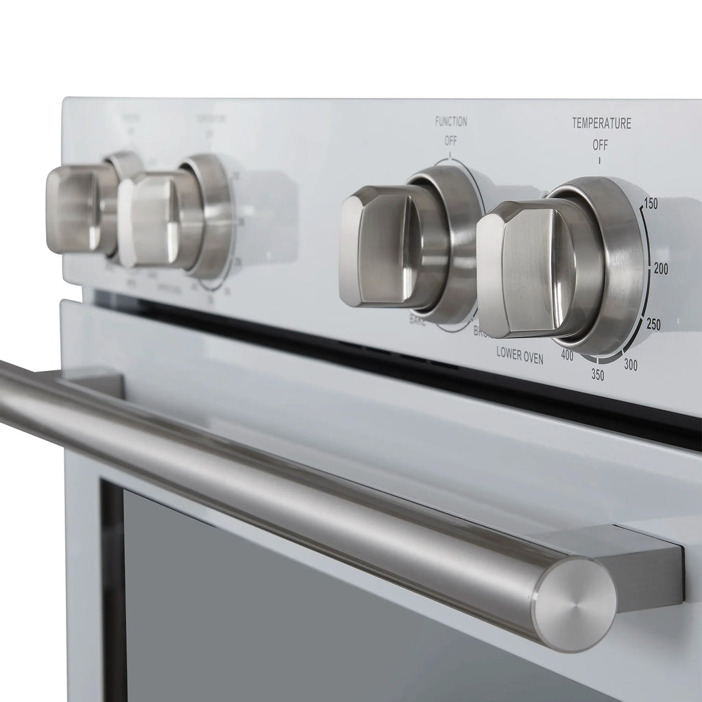 The Forno Vomero 30-Inch Double Wall Oven in White is perfect for everything from weeknight meals to holiday feasts. With a total of 10 cu. ft., you can cook multiple dishes at once for big gatherings. The upper oven offers 6 versatile cooking modes: Bake, Convection Bake, Broil, Convection Broil, Convection Roast, and Defrost, with a 2000W broiler, 1500W bake element, and 50W convection fan for even, efficient heating. The lower oven, equipped with a 2000W broiler and 1500W bake element, is a traditional oven without a convection fan - ideal for classic roasting and baking.