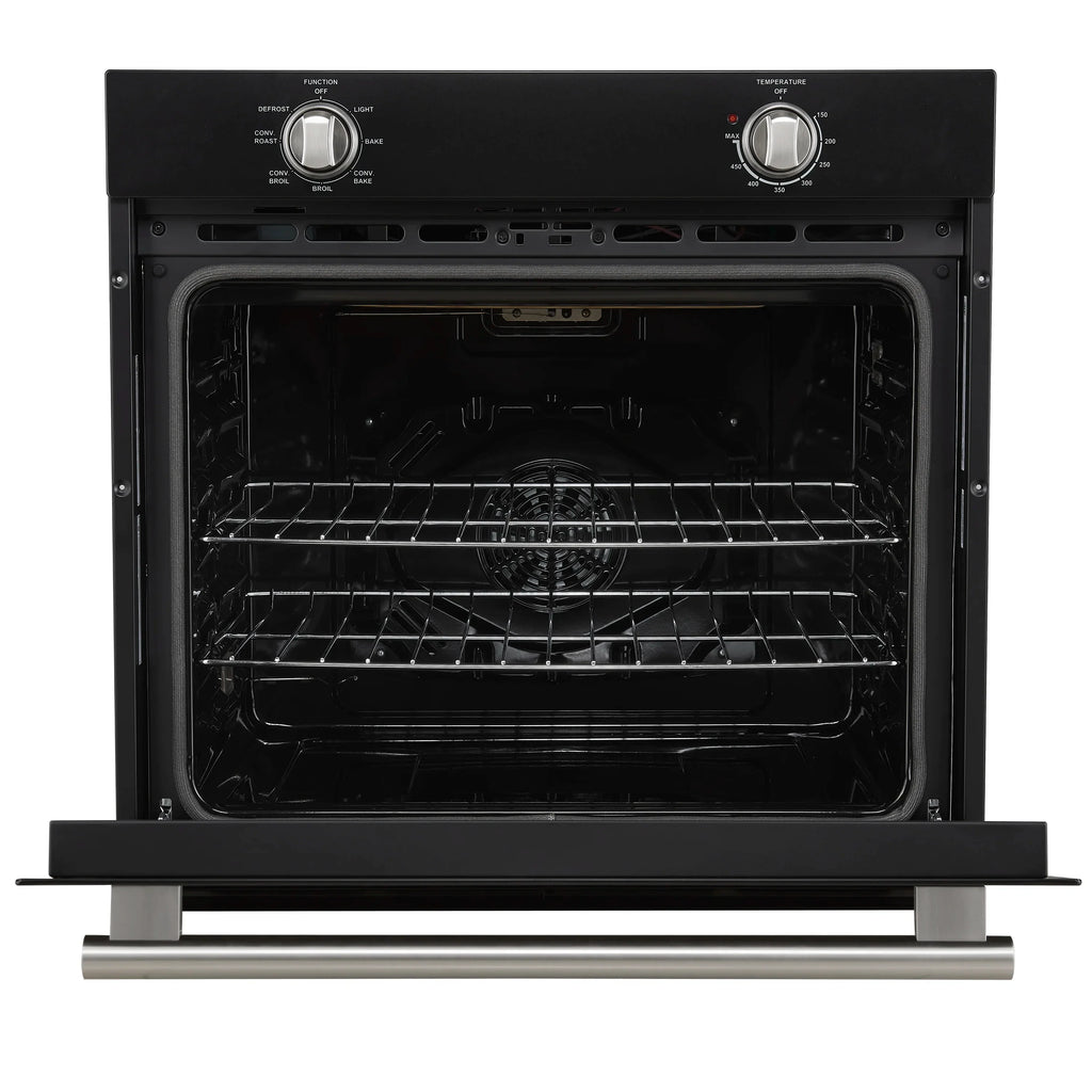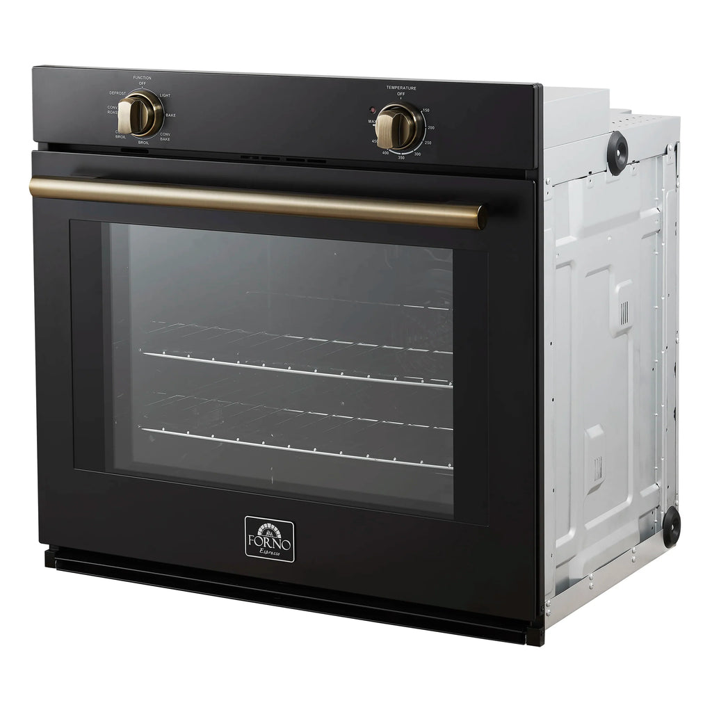 The Forno Vomero 30" Black Wall Oven is designed to handle everything from quick weeknight dinners to elaborate holiday feasts. With a spacious 5 cu. ft. capacity, it offers six versatile cooking modes : Bake, Convection Bake, Broil, Convection Broil, Convection Roast, and Defrost powered by a 2000W broiler, 1500W bake element, and a 50W convection fan for fast, even heating. Featuring six adjustable rack positions and an intuitive mechanical knob control panel, it allows for effortless temperature and function adjustments, while the durable enamel interior and concealed heating elements simplify cleaning without compromising its sleek, modern design. Perfectly suited for both everyday use and special occasions, this oven combines functionality, versatility, and contemporary style, making it a standout centerpiece in any kitchen.