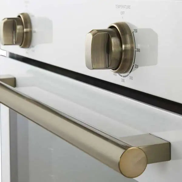 The Forno Vomero 30" White Wall Oven is perfect for everything from weeknight meals to holiday feasts. With 5 cu. ft., this oven offers 6 versatile cooking modes: bake, conv bake, broil, conv broil, conv roast, and defrost, using a 2000W broiler, 1500W bake element, and 50W convection fan for even, efficient heating. Featuring six adjustable rack positions and an intuitive mechanical Antique Brass knob control panel, this oven offers effortless temperature adjustments. The enamel interior and concealed heating elements make cleaning simple while maintaining a sleek, modern look. Designed for both everyday cooking and special occasions, this range combines versatility and style making it a standout addition to any kitchen.
