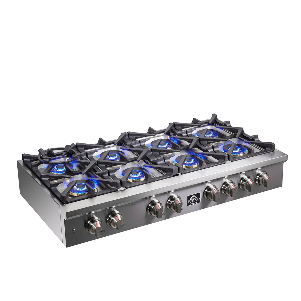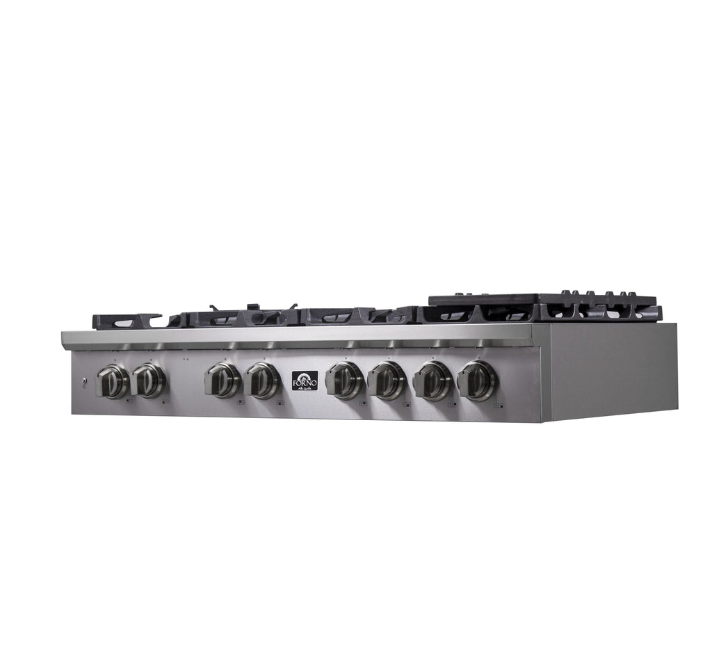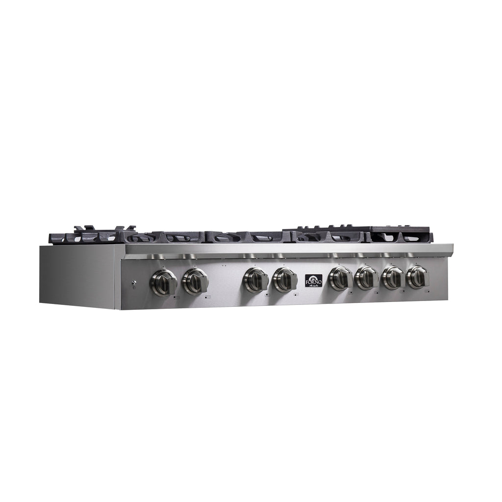 The FORNO ALTA QUALITA 48” Pro-Style Gas Rangetop has a versatile cooktop configuration with 8 sealed dual brass burners totalling 160,000 BTUs to handle any culinary challenge. Heavy duty continuous cast iron grates simplify moving pans around without lifting them off the surface and contoured Zinc Control Knobs allow easy control of the burners for precision gas cooking. Includes Auto-ignition, Griddle, Wok-Ring and LP conversion Kit. Heavy-duty 304 stainless steel cleans easily and beautifully complements other Forno appliances to fit any kitchen design.