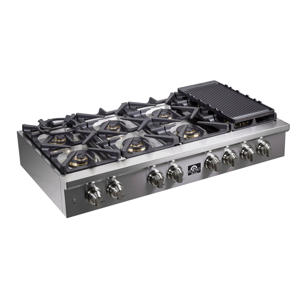 The FORNO ALTA QUALITA 48” Pro-Style Gas Rangetop has a versatile cooktop configuration with 8 sealed dual brass burners totalling 160,000 BTUs to handle any culinary challenge. Heavy duty continuous cast iron grates simplify moving pans around without lifting them off the surface and contoured Zinc Control Knobs allow easy control of the burners for precision gas cooking. Includes Auto-ignition, Griddle, Wok-Ring and LP conversion Kit. Heavy-duty 304 stainless steel cleans easily and beautifully complements other Forno appliances to fit any kitchen design.