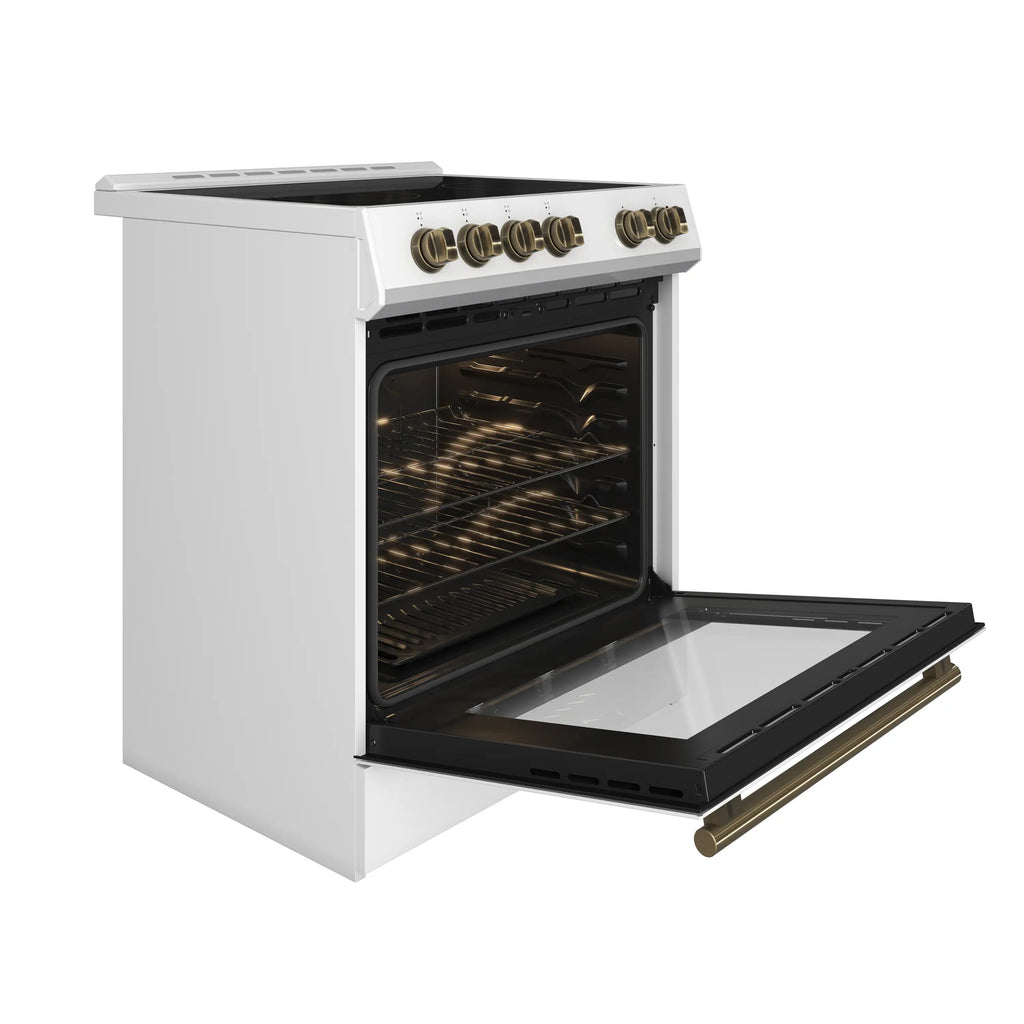 Forno 3-Piece Appliance Package - 30-Inch Espresso Electric Range, Under Cabinet Range Hood, & 31-Inch Refrigerator in White with Antique Brass Handle