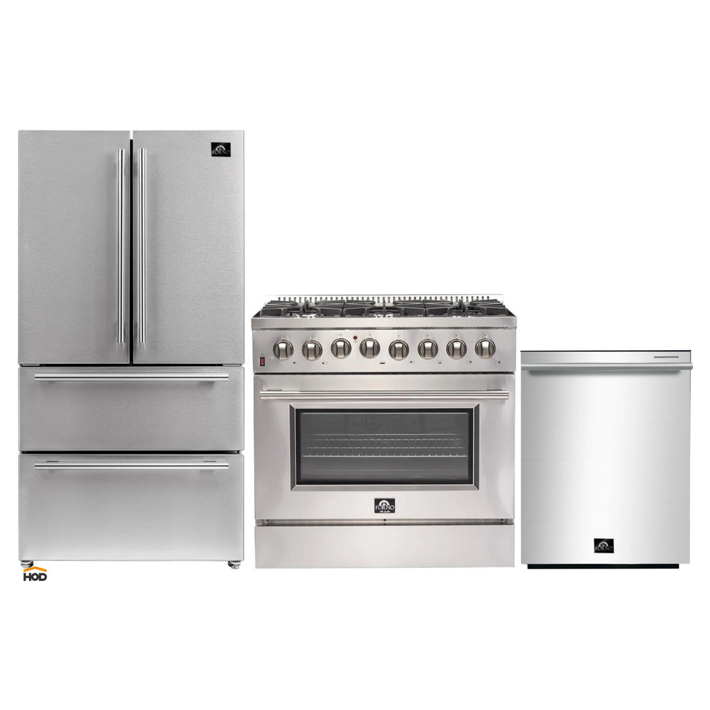 This 36" Dual Fuel Range by Forno offers a 6 Defendi Italian Burner cooktop and a 5.36 cu. ft. oven. The range also features cast-iron grates, convection fan, and halogen lights. Available at Home Outlet Direct