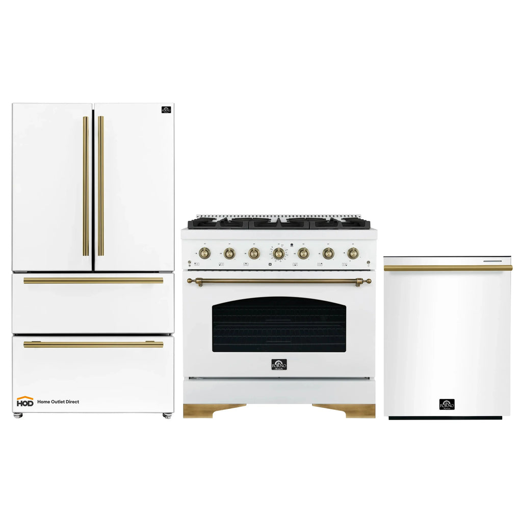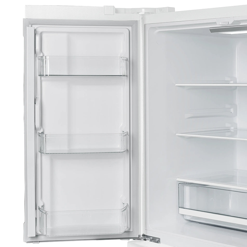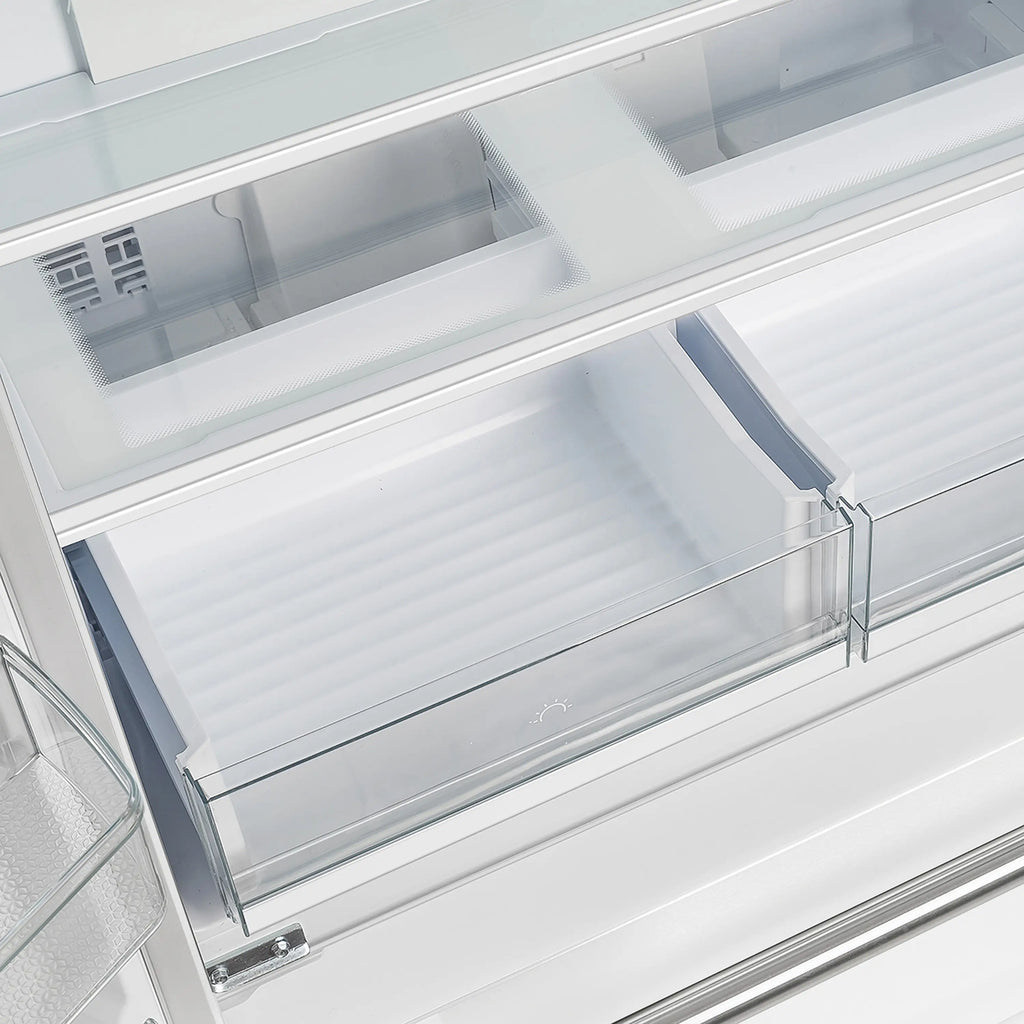 The Forno Espresso Moena 36-inch White French Door refrigerator combines style and functionality with its frost-free multi-air flow cooling system, offering a spacious 19.2 cu.ft. capacity. Adjustable shelving ensures versatile grocery storage, complemented by a compressor inverter for energy efficiency, quiet operation, and precise temperature control. The LED touch panel provides convenient access. The fresh food storage (12.1 cu.ft.) includes three glass shelves (two adjustable), two crisper drawers, and ample door storage. The 7.2 cu.ft. freezer features organized storage with two pull-out drawers, a slide-out tray, and a high-capacity automatic ice maker able to produce up to 4 pounds of ice daily. ENERGY STAR Certified, it incorporates high-efficiency LED lighting. The Espresso collection offers customizability with two sets of handles (stainless-steel or antique brass), adding an elegant finishing touch to this high-performing and stylish appliance.