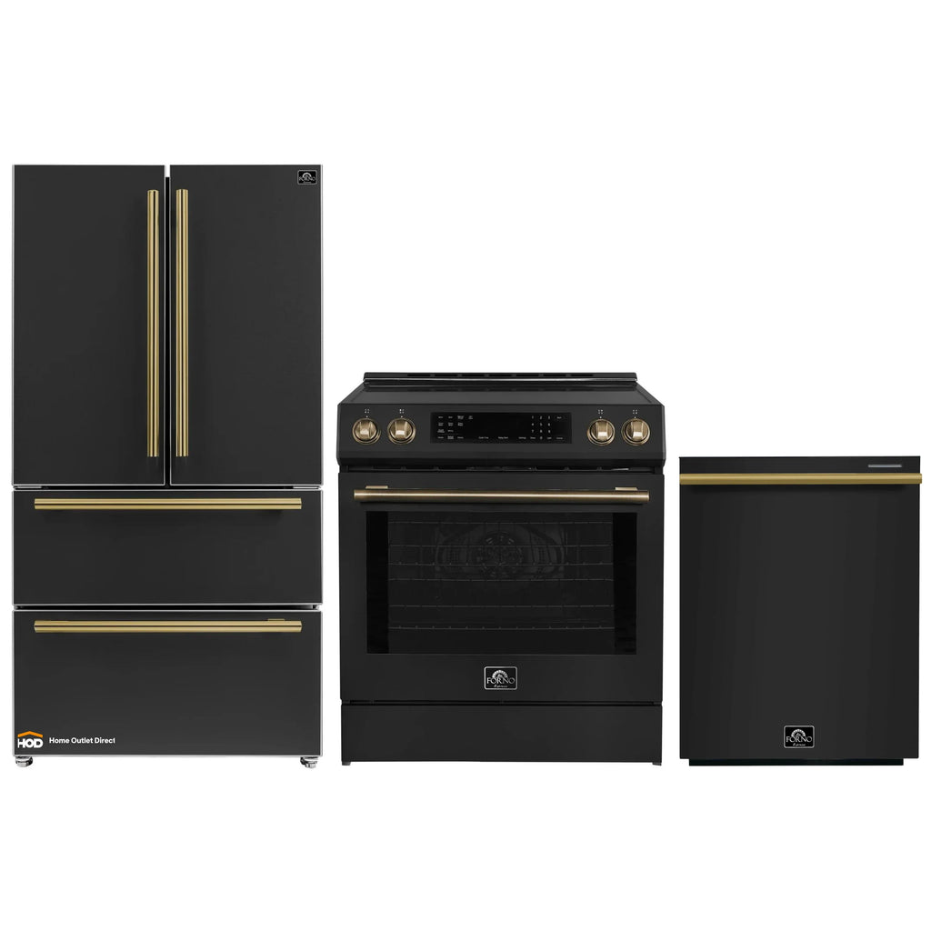The Forno Donatello 30-inch black induction range harmonizes functionality with the precision of induction cooking. Customize your look effortlessly with two sets of interchangeable handles and knobs, switching between antique brass for a traditional touch or stainless steel for modern flair. The cooktop boasts four powerful induction elements totaling 8,100 watts, ensuring fast and precise cooking. The 5.0 cu.ft. speckled blue enamel oven features two racks with six adjustable levels, enabling versatile cooking for multiple dishes simultaneously. With Air Fry functionality, achieve crispy and delicious results effortlessly for healthier cooking options. This range caters to all cooking needs with its powerful cooktop and versatile oven, delivering quality and performance without the high price tags. Lower your cost of living with Forno.