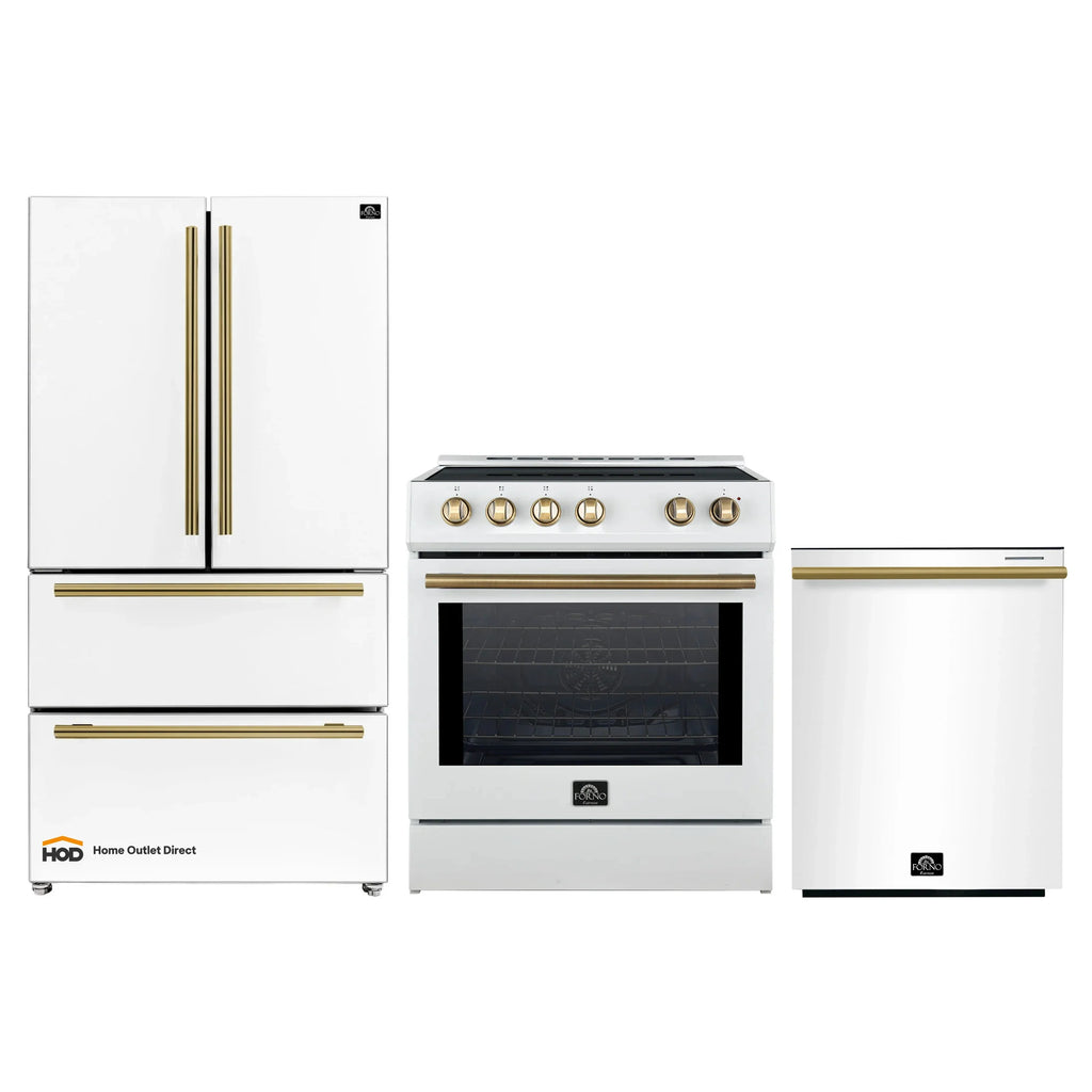The Forno Espresso Moena 36-inch White French Door refrigerator combines style and functionality with its frost-free multi-air flow cooling system, offering a spacious 19.2 cu.ft. capacity. Adjustable shelving ensures versatile grocery storage, complemented by a compressor inverter for energy efficiency, quiet operation, and precise temperature control. The LED touch panel provides convenient access. The fresh food storage (12.1 cu.ft.) includes three glass shelves (two adjustable), two crisper drawers, and ample door storage. The 7.2 cu.ft. freezer features organized storage with two pull-out drawers, a slide-out tray, and a high-capacity automatic ice maker able to produce up to 4 pounds of ice daily. ENERGY STAR Certified, it incorporates high-efficiency LED lighting. The Espresso collection offers customizability with two sets of handles (stainless-steel or antique brass), adding an elegant finishing touch to this high-performing and stylish appliance.