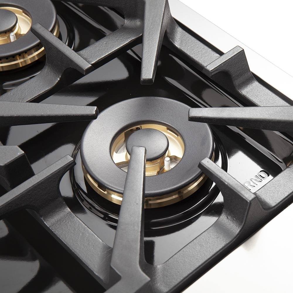The Forno Capriasca 30 Inch Gas Range enhances your home kitchen with professional styling and performance through its durable and beautiful 304-grade stainless-steel design. The cooking surface features 5 sealed dual-ring brass burners, totaling 100,000 BTU. All burners, each at 20,000 BTU, can simmer precisely at 1,000 BTU. Continuous heavy-duty cast-iron grates facilitate easy sliding of pots or pans off heat over the enamel cooktop cavity, simplifying spill cleanup. The 4.32 cu. ft. gas oven, with a 30,000 BTU output and infrared red mesh broiler, enclosed in a blue enamel interior, offers optional convection for precise, and consistent cooking on multiple levels. For convenient viewing, a 3-layer glass oven door window is included. The package includes 3 telescopic stainless-steel oven racks, wok support, and an LP conversion kit. Additionally, zinc-coated illuminated metal knobs with bezel rings ensure enduring beauty.