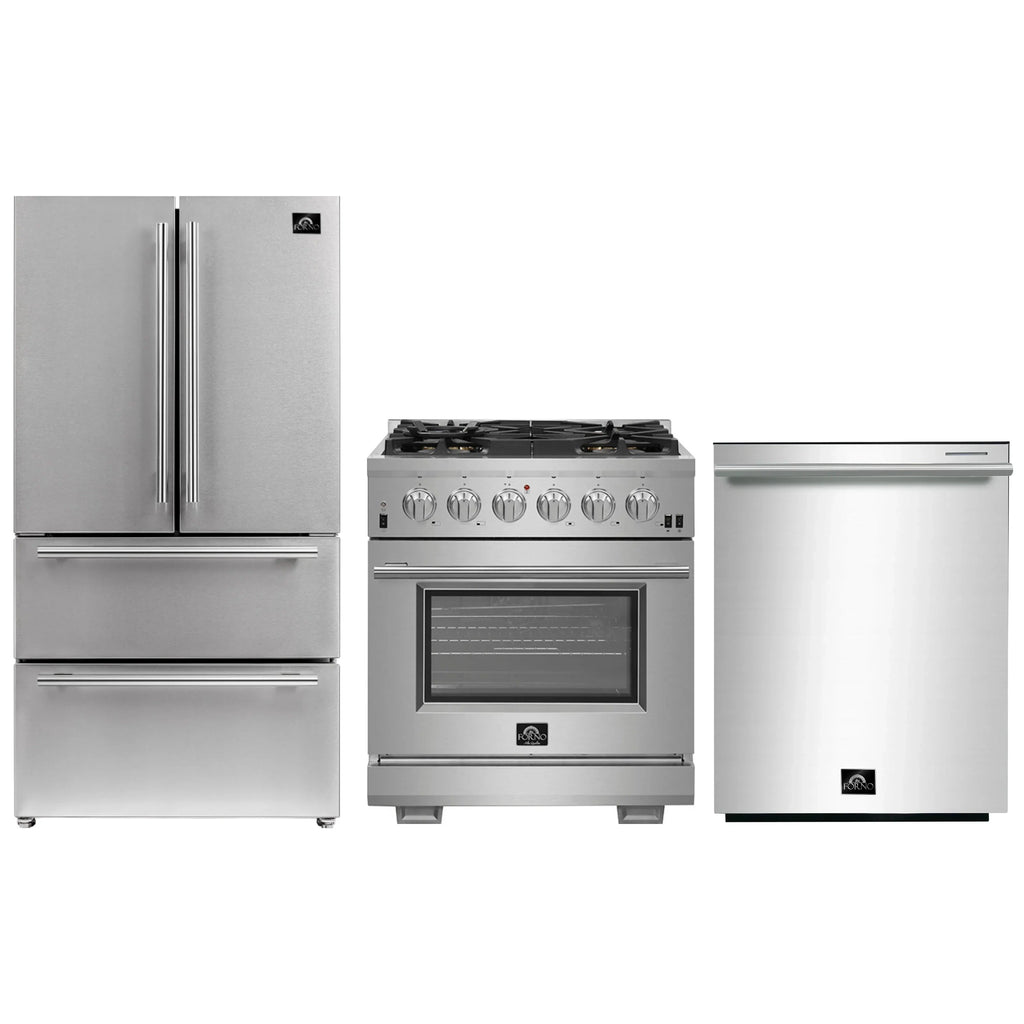The Forno Alta Moena 36 Inch Stainless-Steel French Door refrigerator combines style and functionality with its frost-free multi-air flow cooling system, offering a spacious 19.2 cu.ft. capacity. Adjustable shelving ensures versatile grocery storage, complemented by a compressor inverter for energy efficiency, quiet operation, and precise temperature control. The LED touch panel provides convenient access and control. The fresh food storage (12.1 cu.ft.) features a premium stainless-steel back panel, three glass shelves (two adjustable), two crisper drawers, and ample door storage, all elegantly finished with sleek silver trim. The 7.14 cu.ft. freezer boasts organized storage with two pull-out drawers, a slide-out tray, and a high-capacity automatic ice maker producing up to 4 pounds of ice daily. This counter depth unit also includes a stainless-steel interior panel and silver trim shelves and door bins for a modern touch. ENERGY STAR Certified, it incorporates high-efficiency LED lighting to minimize food spoilage.