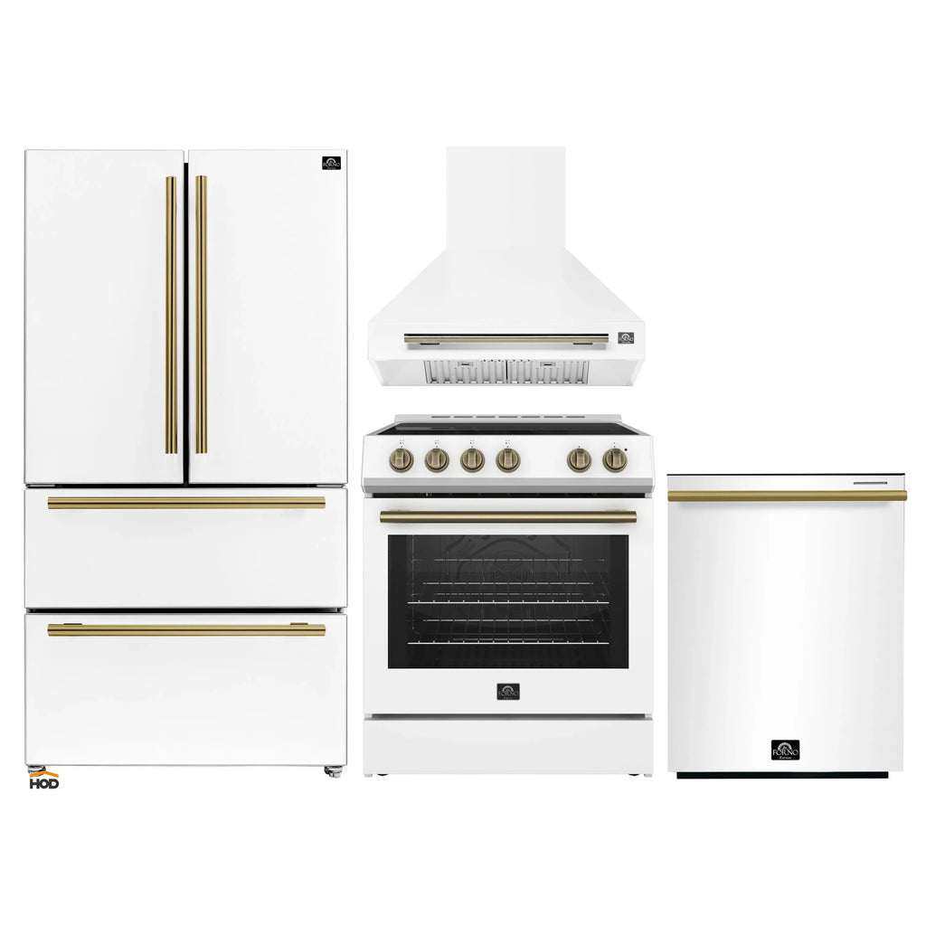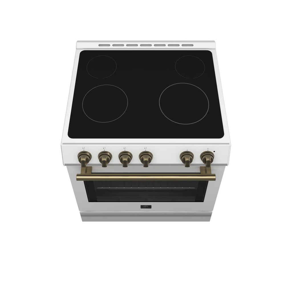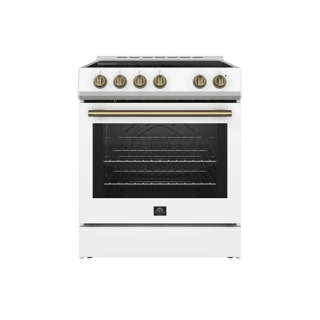 Introducing the Forno Leonardo Espresso 30" 5.0 cu. Ft. White Electric Range, a kitchen game-changer. With Antique Brass accents, 4 Radiant Elements, and a 5,500-watt Convection Oven, it combines style with top-notch performance. Antique Brass Knobs and Handles add a touch of elegance, while Ceramic Glass ensures even heat distribution. The Hidden Bake Element simplifies maintenance by preventing spills and odors. Elevate your kitchen with this timeless, user-friendly range, marrying durability with sophistication. Cook with confidence, and embrace efficiency and style with every use.
