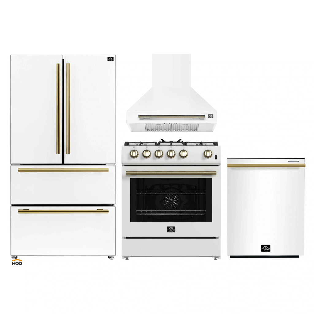 The Forno Espresso Moena 36-inch White French Door refrigerator combines style and functionality with its frost-free multi-air flow cooling system, offering a spacious 19.2 cu.ft. capacity. Adjustable shelving ensures versatile grocery storage, complemented by a compressor inverter for energy efficiency, quiet operation, and precise temperature control. The LED touch panel provides convenient access. The fresh food storage (12.1 cu.ft.) includes three glass shelves (two adjustable), two crisper drawers, and ample door storage. The 7.2 cu.ft. freezer features organized storage with two pull-out drawers, a slide-out tray, and a high-capacity automatic ice maker able to produce up to 4 pounds of ice daily. ENERGY STAR Certified, it incorporates high-efficiency LED lighting. The Espresso collection offers customizability with two sets of handles (stainless-steel or antique brass), adding an elegant finishing touch to this high-performing and stylish appliance.