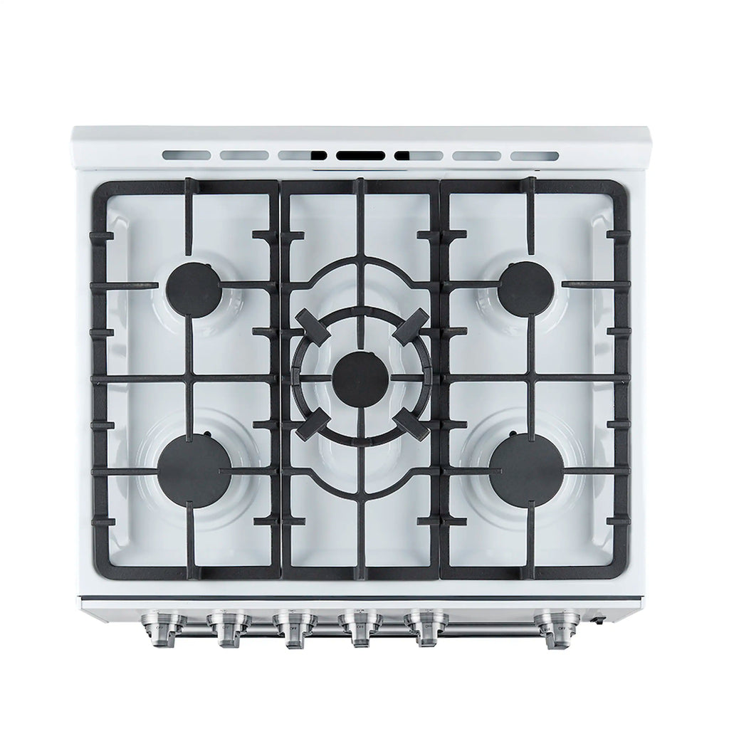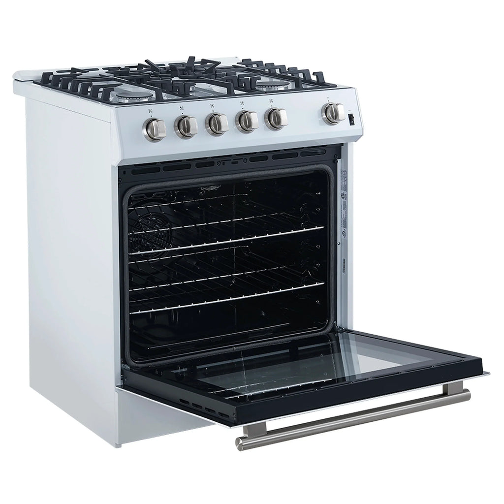 The Forno Leonardo Espresso 30 Inch 5.0 cu.ft. white gas range seamlessly blends style and functionality with the precision of gas power. Its high-performance range top delivers an impressive total output of 39,500 BTU, complemented by continuous cast iron grates that ensure unmatched stability and mobility for your cookware. Thanks to the deep recessed cavity of the black enamel range top, cleaning up spills is effortless. In the 5 cu.ft. convection oven, a combined broil and bake power of 22,500 BTU ensures precision cooking. With two adjustable rack heights and a robust convection fan, achieve consistent heat distribution for uniform cooking across multiple levels, meeting all your culinary needs with perfection.
