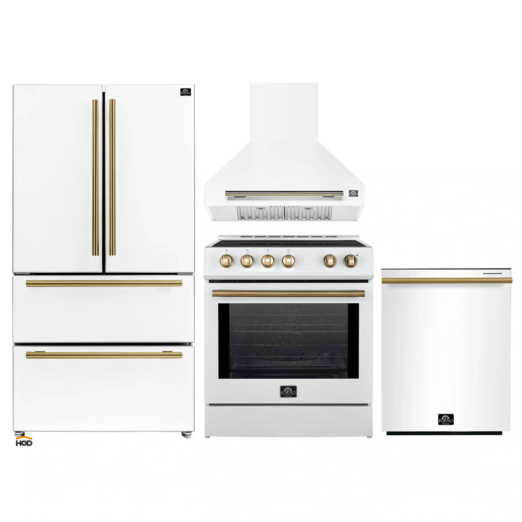 The FORNO Leonardo Espresso 30-Inch White Induction Range elevates your cooking experience with a perfect blend of style, functionality, and reliability. Featuring a elegant white finish, this unit includes knobs and handles in both antique brass and stainless steel, allowing you to customize your kitchen decor. Experience the efficiency of our powerful 8,100-watt induction elements, designed to deliver optimal cooking performance. The 5 cu.ft. convection oven boasts a high-performance convection fan and a broil and bake output of 3,500 watts. With two oven racks at your disposal, explore endless culinary possibilities with ease. The speckled blue enamel interior guarantees consistent heat absorption and retention, ensuring every dish is cooked to perfection. Effortless operation is ensured by friction-resistant hinges, while the hidden bake element prevents spills, simplifying maintenance. Skip the high price tags without sacrificing quality and performance. Lower the cost of living with Forno.