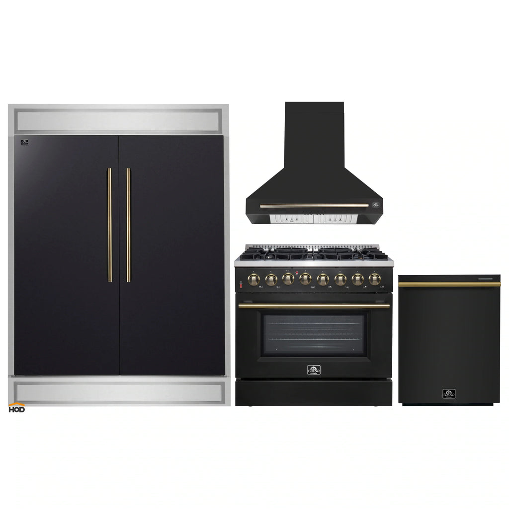 The Forno Galiano 36" Dual Fuel Range in sleek black with antique brass knobs and handles combines timeless style with high performance. Six sealed burners deliver 83,000 BTU total output, including a 20,000 BTU dual-ring burner for precise simmering at 1,000 BTU. The 5.36 cu.ft. true convection fan oven ensures even baking with a powerful 6,300-watt output. Black enamel interiors enhance heat distribution and are easy to clean, while smooth friction hinges and a 3-layer glass door ensure safety and durability. Adjustable stainless steel legs fit counters from 36" to 37". Includes 2 heavy-duty racks, a NEMA 14-50P power cord, and LP conversion kit. Backed by Forno’s 2-year in-house warranty for lasting peace of mind.