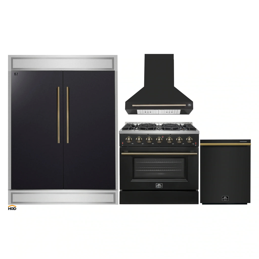 The Forno Galiano 36-Inch Gas Range in sleek black with antique brass hardware elevates your kitchen with a balance of elegance and high performance. The contrasting white front, antique brass knobs and handles, and stainless steel surroundings offer a striking yet refined aesthetic that complements any kitchen design. It boasts 6 sealed burners with a total output of 83,000 BTU, including a 20,000 BTU dual-ring burner for precise simmering at 1,000 BTU. Continuous cast iron grates ensure cookware stability and seamless movement between burners. The spacious 5.26 cu.ft. convection oven offers 30,000 BTU total broil and bake output, a black enamel interior for easy maintenance, and a three-layer tempered glass oven door for optimal heat retention and a clear view inside. Features include two oven racks, a LP conversion kit, and antique brass knobs, blending style with superior functionality. Backed by Forno’s 2-year warranty, this range offers lasting durability and peace of mind. Forno, Lower the cost of living.