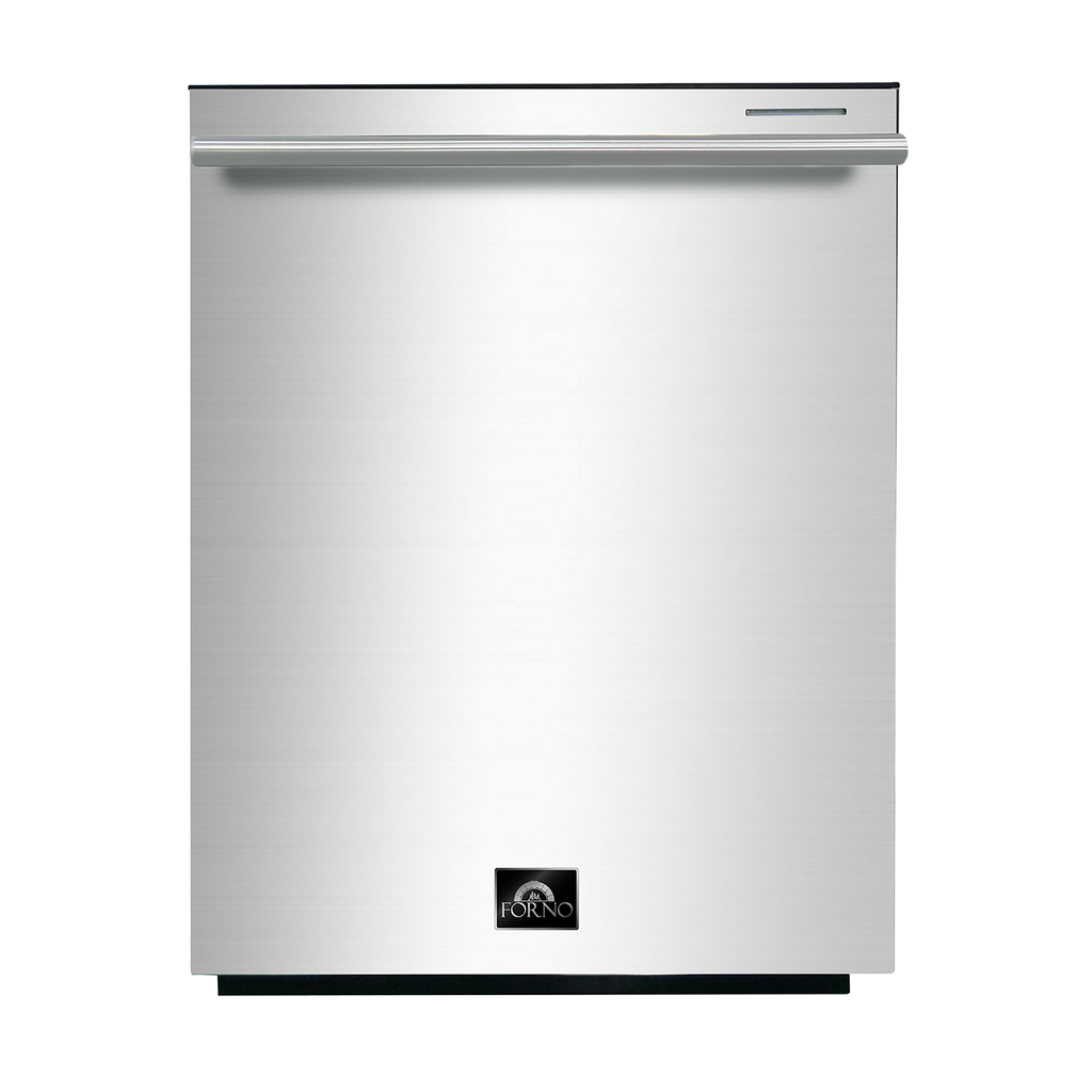 The Forno Pozzo 24-Inch tall-tub dishwasher, operating at a low noise level of 49 decibels for peaceful cleaning. Its stainless-steel front and pro-style handle offer durability and style. The dishwasher features a spacious stainless-steel tub with 3 baskets, providing ample loading flexibility for large dish capacity and utensils, with 3 racks and an additionnal silverware basket. With six wash programs and electronic controls featuring a sleek LED display, it offers efficient and customizable cleaning options. Energy Star certified for eco-friendly operation.