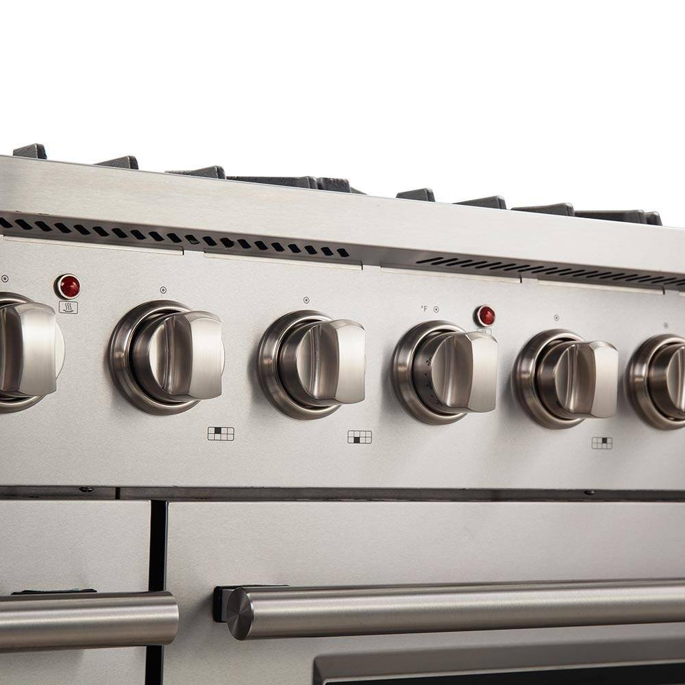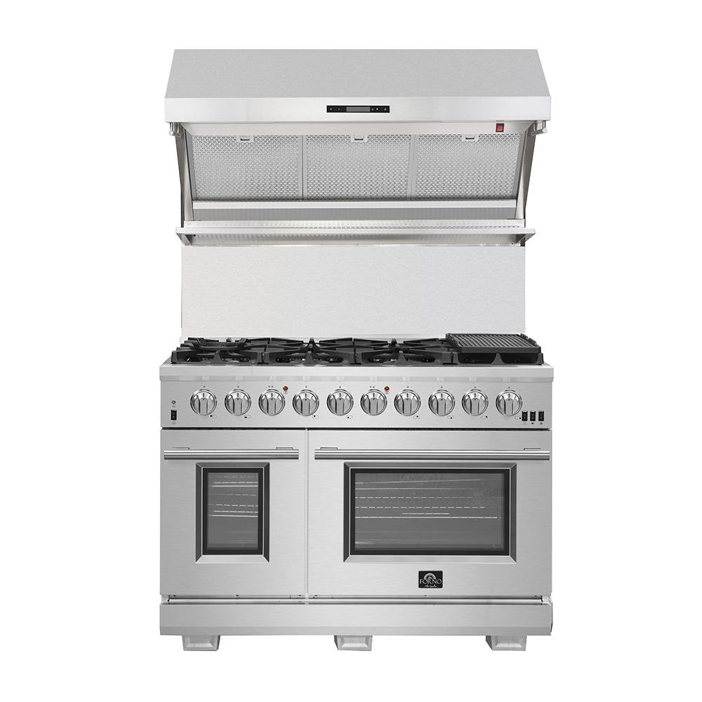 The 48 Inch Forno Galiano Gas Range brings professional styling and performance into your home kitchen with its durable stainless-steel design. The cooking surface has 8 sealed burners with a total output of 107,000 BTU, which one is a 20,000 BTU dual-ring burner that can simmer at 1,000 BTU. Continuous cast iron grates ensure stability on the enamel surface. The main oven of 4.32 Cu.Ft has a convection fan with 30,000 BTU Total Broil and Bake output. The secondary oven has a capacity of 2.26 Cu.Ft. with a 14,000 BTU Bake output. Both ovens have an impressive enamel interiors allowing for easy cleaning and 3-layer glass oven door window provides both heat retention and an unobstructed view. It features 2 racks per oven, reversible griddle, an LP conversion kit, and durable zinc-coated metal knobs. Elevate your kitchen with performance, convenience, and enduring elegance.