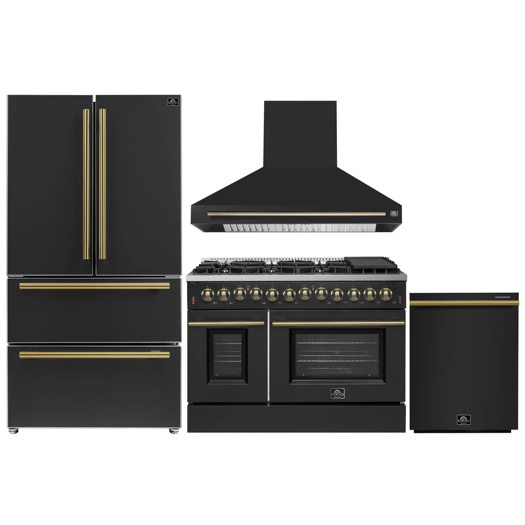 The Forno Galiano 48" Dual Fuel Range in sleek black with antique brass knobs and handles brings bold elegance and professional performance to your kitchen. Eight sealed burners produce 107,000 BTU, including a versatile 20,000 BTU dual-ring burner for simmering at 1,000 BTU. Dual ovens provide 6.58 cu.ft. total capacity: the 4.32 cu.ft. true convection oven with 6,300-watt output ensures consistent results, while the 2.26 cu.ft. secondary oven with 3,400 watts adds flexibility. Black enamel interiors simplify cleaning, while friction hinges and 3-layer glass doors enhance durability and safety. Includes 4 racks, griddle, LP conversion kit, and NEMA 14-50P power cord. Forno’s 2-year in-house warranty guarantees peace of mind.