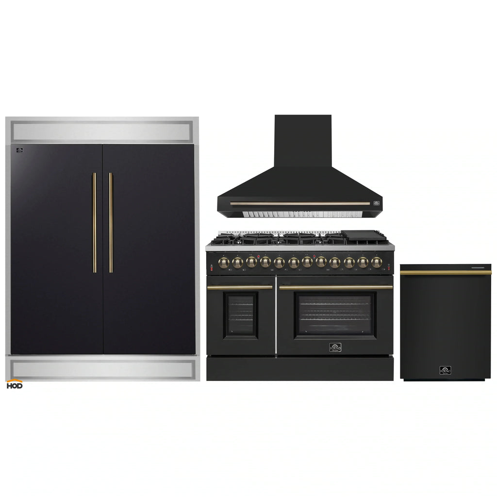 The Forno Galiano 48" Dual Fuel Range in sleek black with antique brass knobs and handles brings bold elegance and professional performance to your kitchen. Eight sealed burners produce 107,000 BTU, including a versatile 20,000 BTU dual-ring burner for simmering at 1,000 BTU. Dual ovens provide 6.58 cu.ft. total capacity: the 4.32 cu.ft. true convection oven with 6,300-watt output ensures consistent results, while the 2.26 cu.ft. secondary oven with 3,400 watts adds flexibility. Black enamel interiors simplify cleaning, while friction hinges and 3-layer glass doors enhance durability and safety. Includes 4 racks, griddle, LP conversion kit, and NEMA 14-50P power cord. Forno’s 2-year in-house warranty guarantees peace of mind.