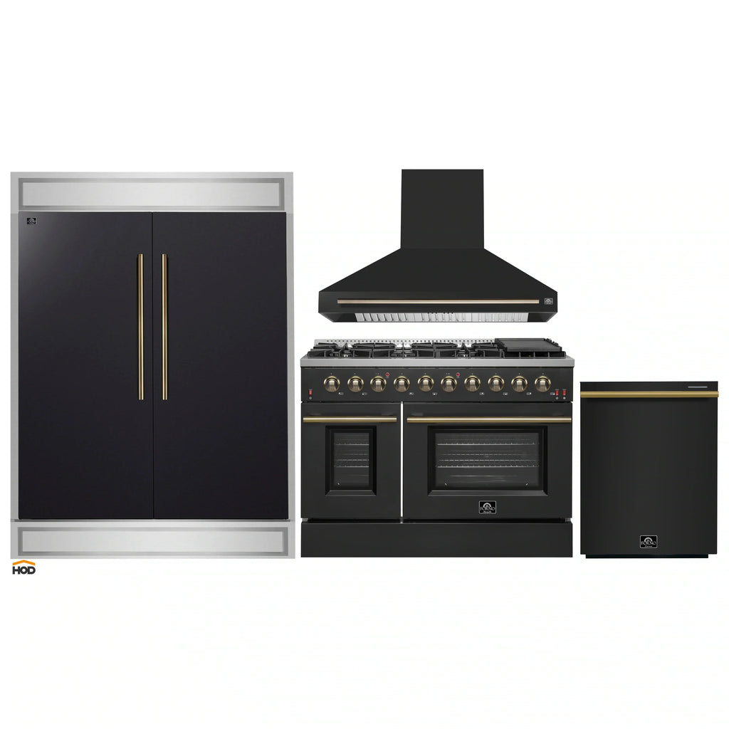 The 48-Inch Forno Galiano Gas Range combines professional-grade performance with bold elegance. Featuring a sleek black finish accented by antique brass hardware, it brings a statement of style and durability to your kitchen. With 8 sealed burners delivering a total output of 107,000 BTU, including a 20,000 BTU dual-ring burner capable of simmering at 1,000 BTU, this range provides the versatility to handle any culinary challenge. Continuous cast iron grates ensure stability and effortless cookware movement on the durable enamel cooktop. Bake, roast, or broil with precision using the 4.32 cu.ft. convection main oven with 30,000 BTU total output for even heat distribution. The 2.26 cu.ft. secondary oven, featuring a 14,000 BTU bake output, allows you to prepare multiple dishes at once. Both ovens boast enamel interiors for effortless cleaning and three-layer glass doors for superior heat retention and visibility. Convenience meets functionality with two racks per oven, a reversible griddle, and an LP conversion kit for flexible installation. Backed by Forno's 2-year warranty, this gas range delivers powerful performance, enduring style, and complete peace of mind. Forno, Lower the cost of living.
