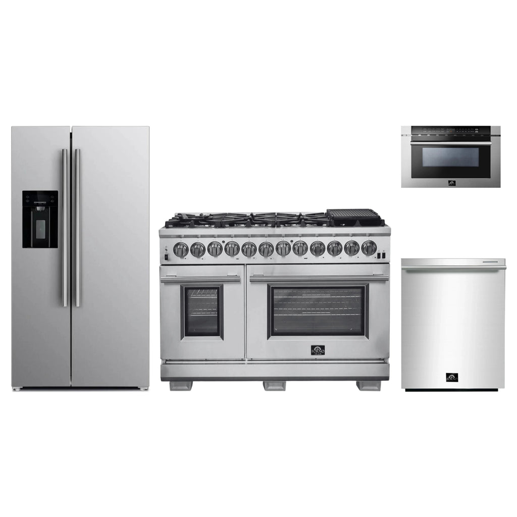 This 48" Pro-Style Dual Fuel Range by Forno offers a 8 Defendi Italian Brass Burner cooktop and 6.58 cu. ft. of total oven capacity. The range also features cast-iron grates, convection fan, and halogen lighting. Available at Home Outlet Direct.