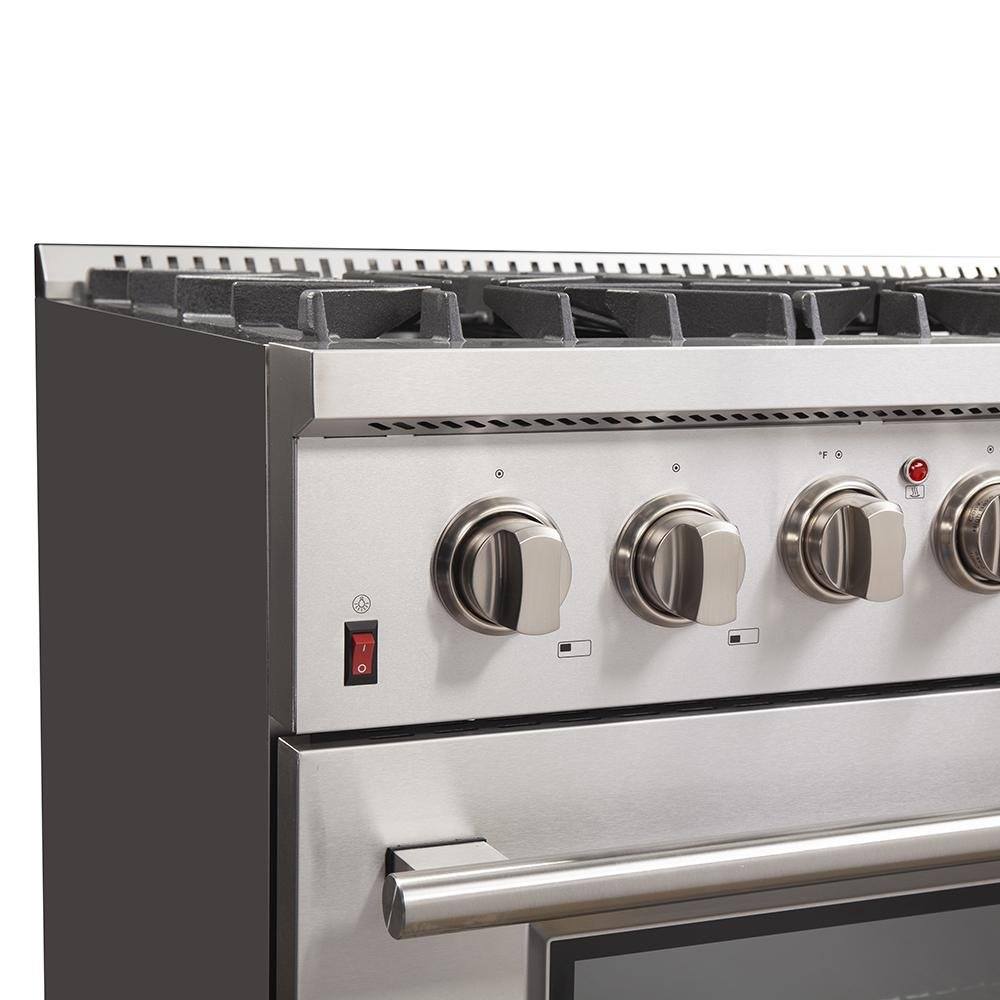 This 36" Dual Fuel Range by Forno offers a 6 Defendi Italian Burner cooktop and a 5.36 cu. ft. oven. The range also features cast-iron grates, convection fan, and halogen lights. Available at Home Outlet Direct