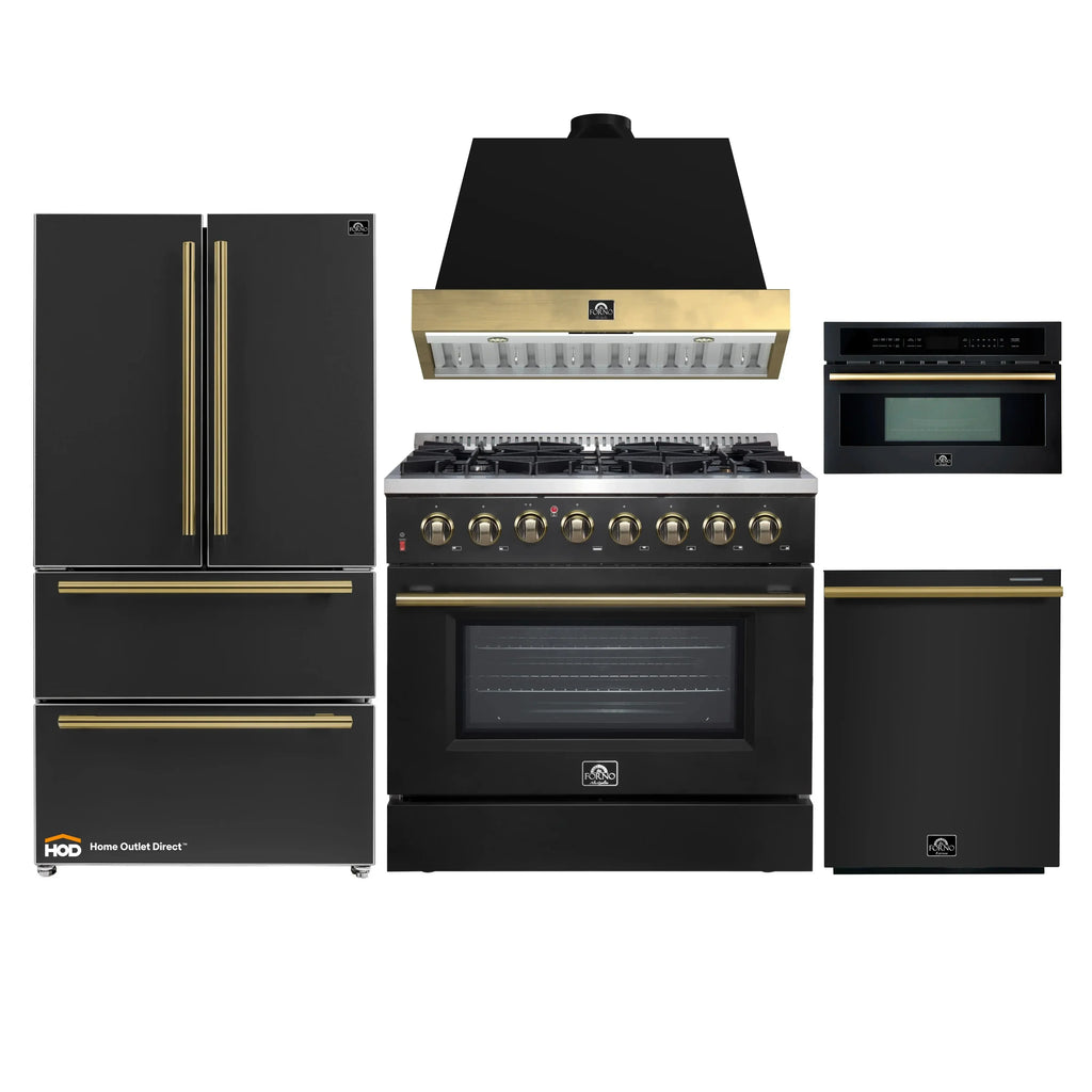 The Forno Galiano 36" Dual Fuel Range in sleek black with antique brass knobs and handles combines timeless style with high performance. Six sealed burners deliver 83,000 BTU total output, including a 20,000 BTU dual-ring burner for precise simmering at 1,000 BTU. The 5.36 cu.ft. true convection fan oven ensures even baking with a powerful 6,300-watt output. Black enamel interiors enhance heat distribution and are easy to clean, while smooth friction hinges and a 3-layer glass door ensure safety and durability. Adjustable stainless steel legs fit counters from 36" to 37". Includes 2 heavy-duty racks, a NEMA 14-50P power cord, and LP conversion kit. Backed by Forno’s 2-year in-house warranty for lasting peace of mind.