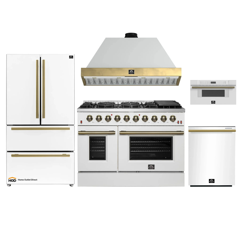 The 48-Inch Forno Galiano Gas Range redefines your kitchen with its professional-grade performance and timeless charm. Finished in sleek white with antique brass hardware, it brings sophistication and durability to any home. With 8 sealed burners delivering a total output of 107,000 BTU, including a 20,000 BTU dual-ring burner capable of simmering at 1,000 BTU, this range provides the versatility to handle any dish. Continuous cast iron grates ensure stability and effortless cookware movement across the durable enamel cooktop. Cook with confidence using the 4.32 cu.ft. convection main oven with 30,000 BTU total output, ideal for even baking and roasting. The 2.26 cu.ft. secondary oven, with its 14,000 BTU bake output, adds flexibility for simultaneous meal preparation. Both ovens feature enamel interiors for easy cleaning and three-layer glass doors for optimal heat retention and clear visibility. Designed for convenience, the range includes two racks per oven, a reversible griddle, and an LP conversion kit for adaptable installation. Backed by Forno's 2-year warranty, this gas range offers exceptional performance, elegant design, and peace of mind. Forno, Lower the cost of living.
