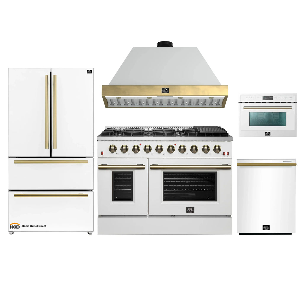 The 48-Inch Forno Galiano Gas Range redefines your kitchen with its professional-grade performance and timeless charm. Finished in sleek white with antique brass hardware, it brings sophistication and durability to any home. With 8 sealed burners delivering a total output of 107,000 BTU, including a 20,000 BTU dual-ring burner capable of simmering at 1,000 BTU, this range provides the versatility to handle any dish. Continuous cast iron grates ensure stability and effortless cookware movement across the durable enamel cooktop. Cook with confidence using the 4.32 cu.ft. convection main oven with 30,000 BTU total output, ideal for even baking and roasting. The 2.26 cu.ft. secondary oven, with its 14,000 BTU bake output, adds flexibility for simultaneous meal preparation. Both ovens feature enamel interiors for easy cleaning and three-layer glass doors for optimal heat retention and clear visibility. Designed for convenience, the range includes two racks per oven, a reversible griddle, and an LP conversion kit for adaptable installation. Backed by Forno's 2-year warranty, this gas range offers exceptional performance, elegant design, and peace of mind. Forno, Lower the cost of living.