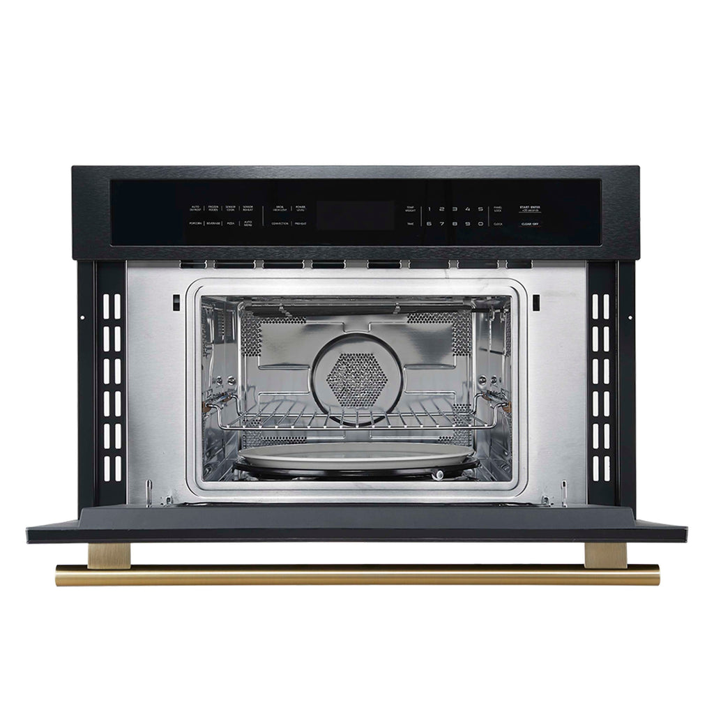 The Forno Oliena 30-Inch 1.6 cu.ft. Microwave & Convection Oven combines style and practicality for any modern kitchen. Featuring a sophisticated black finish and two handle options—antique brass and stainless steel—it adds a touch of elegance to your kitchen decor. Its stainless-steel interior makes cleaning a breeze, while the easy-to-use controls let you seamlessly switch between microwave and oven functions. With 1,000 watts of cooking power, you can boil water in just 1 minute and 50 seconds using standard microwave settings.