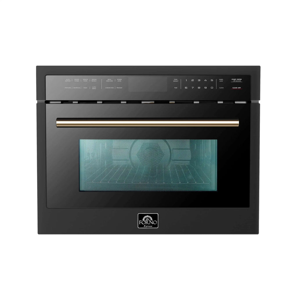 This unit features a sophisticated black finish and comes with two handle options—stainless steel and antique brass—allowing you to customize the look to match your kitchen decor. Experience convenience and efficiency with our multi-functional microwave and convection oven combo.