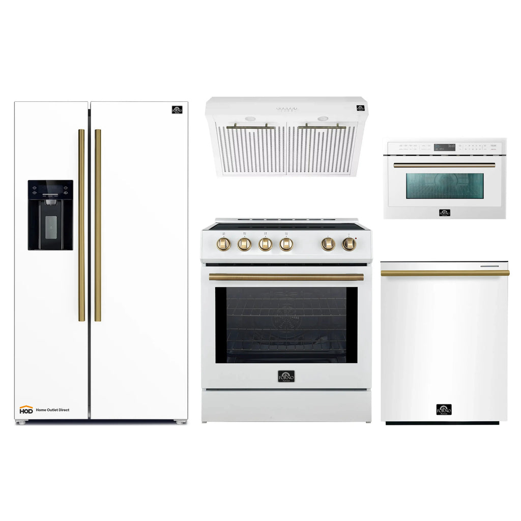 The FORNO Leonardo Espresso 30-Inch White Induction Range elevates your cooking experience with a perfect blend of style, functionality, and reliability. Featuring a elegant white finish, this unit includes knobs and handles in both antique brass and stainless steel, allowing you to customize your kitchen decor. Experience the efficiency of our powerful 8,100-watt induction elements, designed to deliver optimal cooking performance. The 5 cu.ft. convection oven boasts a high-performance convection fan and a broil and bake output of 3,500 watts. With two oven racks at your disposal, explore endless culinary possibilities with ease. The speckled blue enamel interior guarantees consistent heat absorption and retention, ensuring every dish is cooked to perfection. Effortless operation is ensured by friction-resistant hinges, while the hidden bake element prevents spills, simplifying maintenance. Skip the high price tags without sacrificing quality and performance. Lower the cost of living with Forno.
