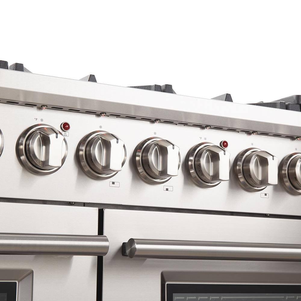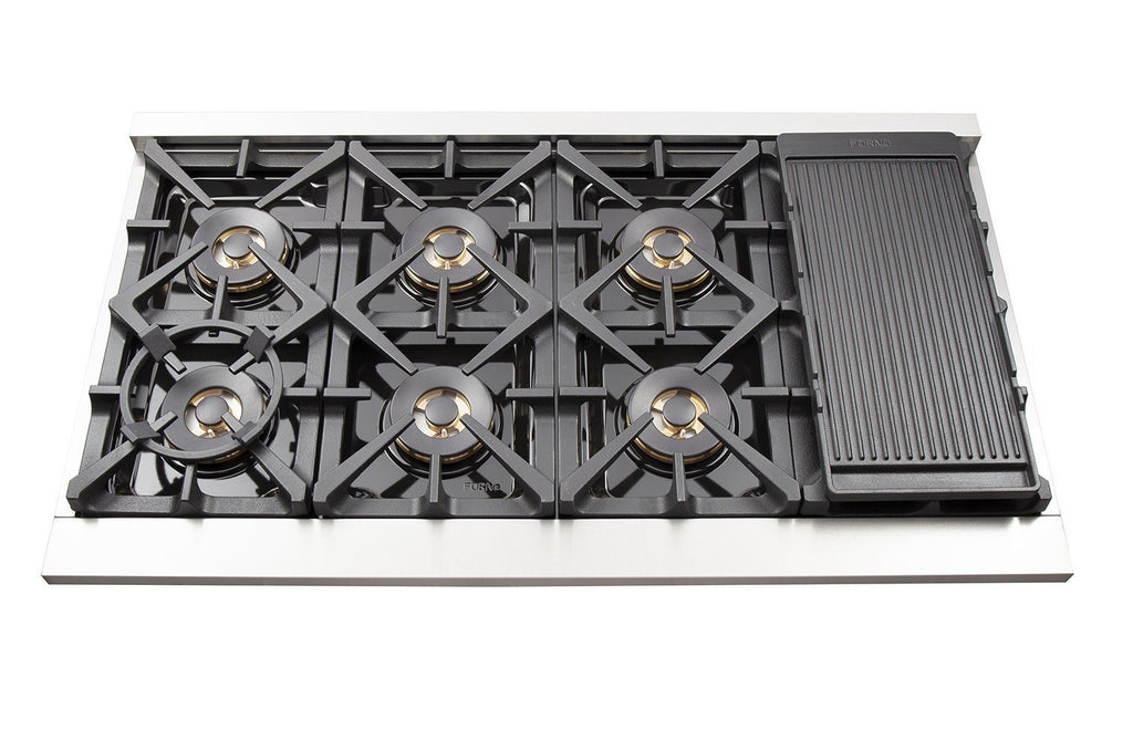 This 48" Pro-Style Gas Range by Forno offers an 8 Defendi Italian Brass Burner cooktop and 6.58 cu. ft. of total oven capacity. The range also features cast-iron grates, convection fan, and halogen lighting. Available at Home Outlet Direct.