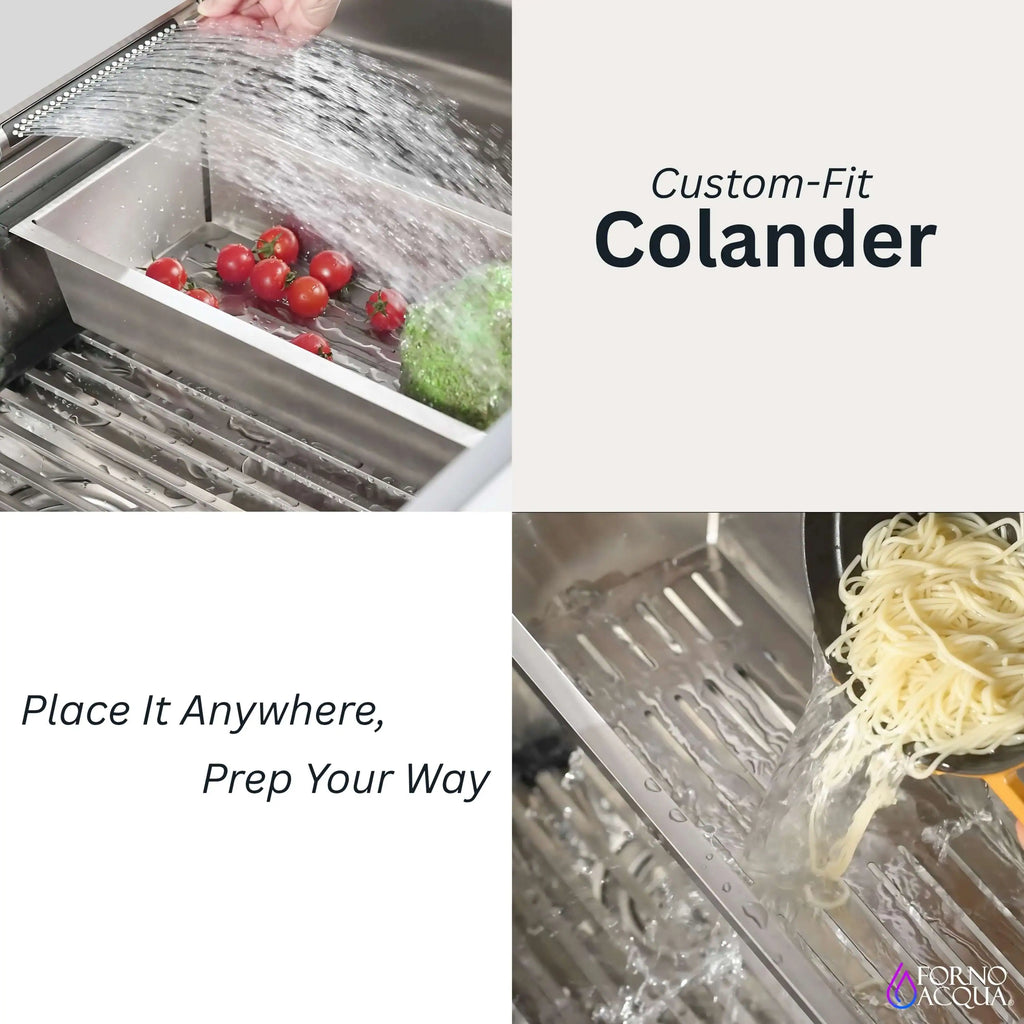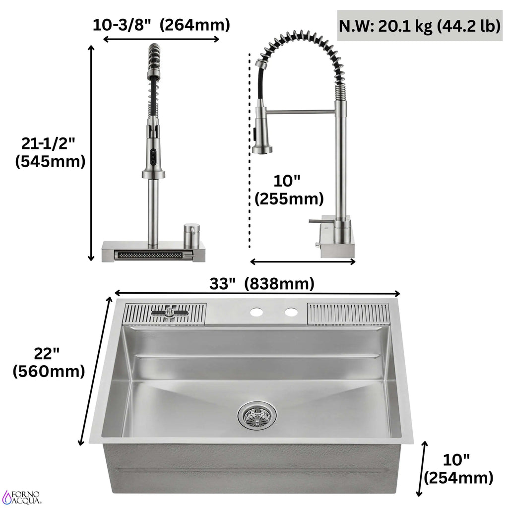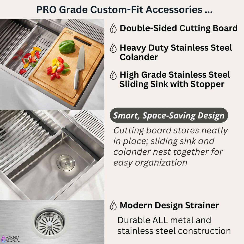 Elevate your kitchen with the MultiSINK Chef Workstation a sculpted centerpiece built for beauty and performance. Its 3-level design and 10" deep basin create seamless zones for prep, rinse, and cleanup. The stainless steel pivoting waterfall Chef faucet offers three spray modes Boost Blade, aerated flow, and rinse while the integrated glass washer keeps drinkware spotless. A double-sided bamboo cutting board, stainless steel sliding sink and colander, and four heavy-duty roll-up grids adapt to your workflow. Two removable drying grilles sit elegantly on the deck, adding utility without clutter. With dual-mount flexibility, cUPC certification, and precision-crafted corners, MultiSINK blends timeless design with everyday efficiency.