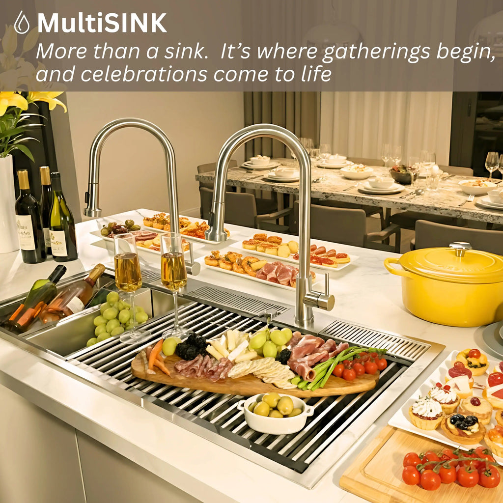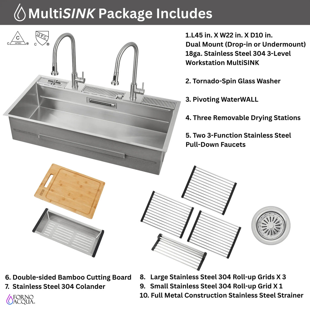Transform your kitchen into a multitasking powerhouse with the MultiSINK Pro45XL Workstation. This all-in-one solution features three functional levels for seamless prep, rinse, and dry, plus custom-fit accessories that elevate every task. The integrated pivoting WaterWALL rinse zone delivers effortless cleaning from any angle, while the powerful glass washer ensures spotless drinkware every time. On-deck drying stations maximize space and efficiency, and dual 3-function high-arch faucets are built for two users with boost-blade cleaning power. Dual-mount installation and IAPMO certification ensure lasting quality and universal fit. Complete with a sliding sink, bamboo cutting board, colander, and four heavy-duty roll-up grids, this workstation is designed for serious cooks, shared kitchens, and stunning island installations.