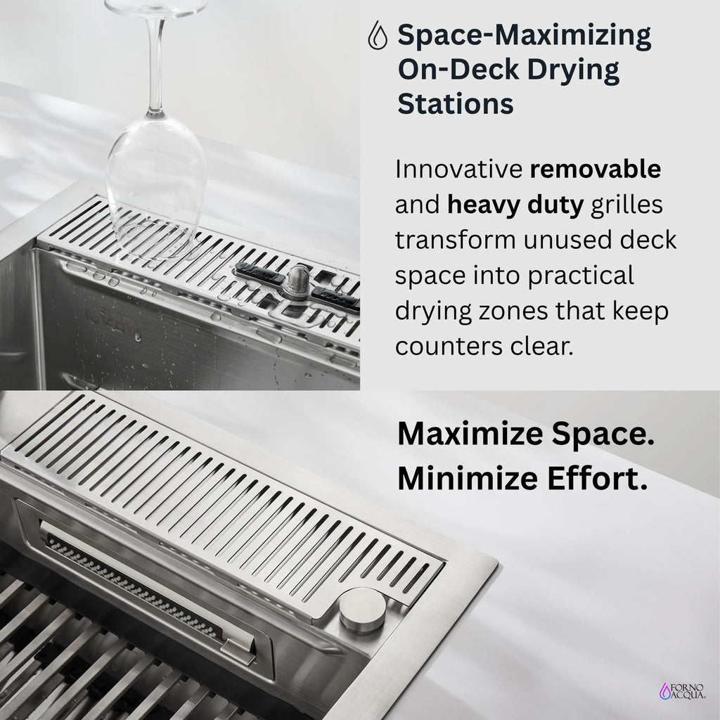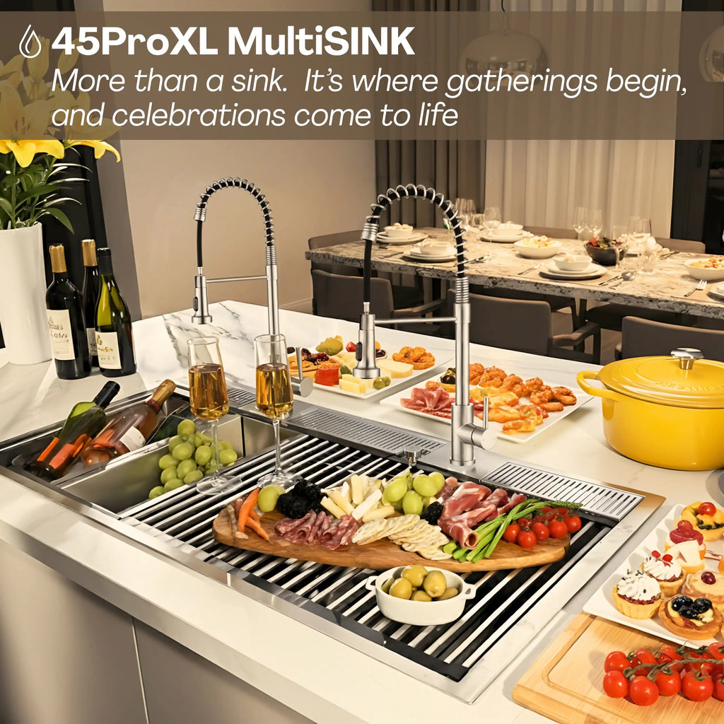 Transform your kitchen into a multitasking powerhouse with the MultiSINK ProChef45XL Workstation. This all-in-one solution features three functional levels for seamless prep, rinse, and dry, plus custom-fit accessories that elevate every task. The integrated pivoting WaterWALL rinse zone delivers effortless cleaning from any angle, while the powerful glass washer ensures spotless drinkware every time. On-deck drying stations maximize space and efficiency, and dual 3-function Chef faucets are built for two users with boost-blade cleaning power. Dual-mount installation and IAPMO certification ensure lasting quality and universal fit. Complete with a sliding sink, bamboo cutting board, colander, and four heavy-duty roll-up grids, this workstation is designed for serious cooks, shared kitchens, and stunning island installations.