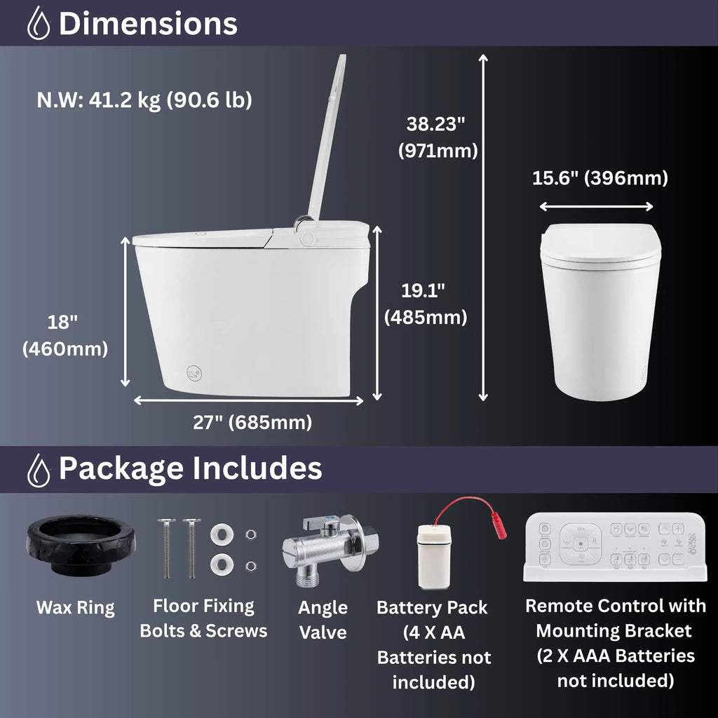 FORNO ACQUA Super Smart Toilet – The Ultimate Bathroom Upgrade. Transform your bathroom with the FORNO ACQUA Super Smart Toilet. This advanced tankless bidet toilet is designed for modern homes, offering full customization for a truly personalized cleansing experience. Adjustable bidet wand extension, water temperature and pressure settings. Auto-sensing lid, seat, and flush plus Foot sensor for total touchless operation. Certified to MaP’s highest performance standards, the Auto Dual Flush system delivers powerful, clog-free performance. Built-in heated seat for year-round comfort. Integrated deodorizer for a fresher bathroom environment. Combining comfort, hygiene, and smart technology, the FORNO ACQUA Smart Toilet is the perfect upgrade for any bathroom. Whether you're remodeling or building new, this intelligent toilet delivers a cleaner, more elegant lifestyle. Experience the future of bathroom innovation with your FORNO ACQUA Super Smart Toilet.