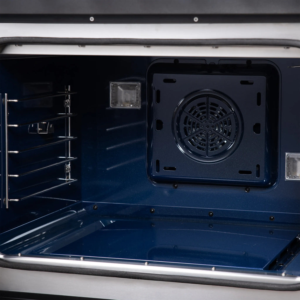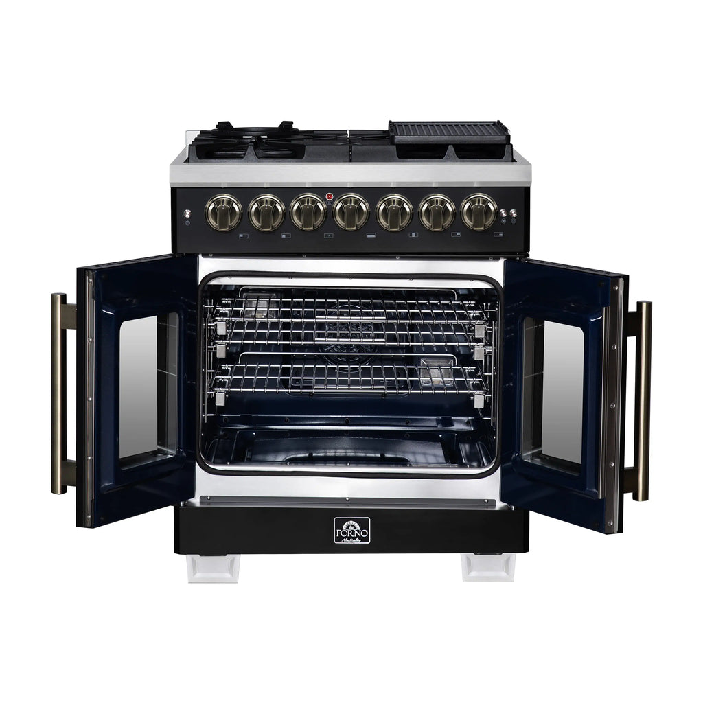 The Forno Capriasca 30 Inch French Door Dual Fuel Range in black with antique brass accessories brings professional-grade style and performance into your kitchen. Its signature French doors open outward to provide up to 12 inches of extra clearance, giving you easier access to the oven. The gas cooktop features five sealed dual-ring brass burners with a powerful 100,000 BTU total output, including a 20,000 BTU burner perfect for rapid boiling, high-heat searing, or gentle simmering of sauces and melted chocolate. Heavy-duty cast iron grates span the surface for maximum stability and smooth movement of cookware, while the recessed enamel cavity helps contain spills for effortless cleaning. Inside, the 4.32 cu. ft. electric oven delivers 6,300 watts of cooking power with true convection technology, ensuring fast, precise, and consistent results. A speckled blue enamel interior adds durability and easy maintenance, while the triple-layer glass oven door window provides clear visibility without sacrificing heat retention. The Capriasca also includes premium accessories: three stainless steel telescopic oven racks, an LP conversion kit, wok ring, reversible griddle, rotisserie kit with skewers, and an air fry basket with rack and drip pan.