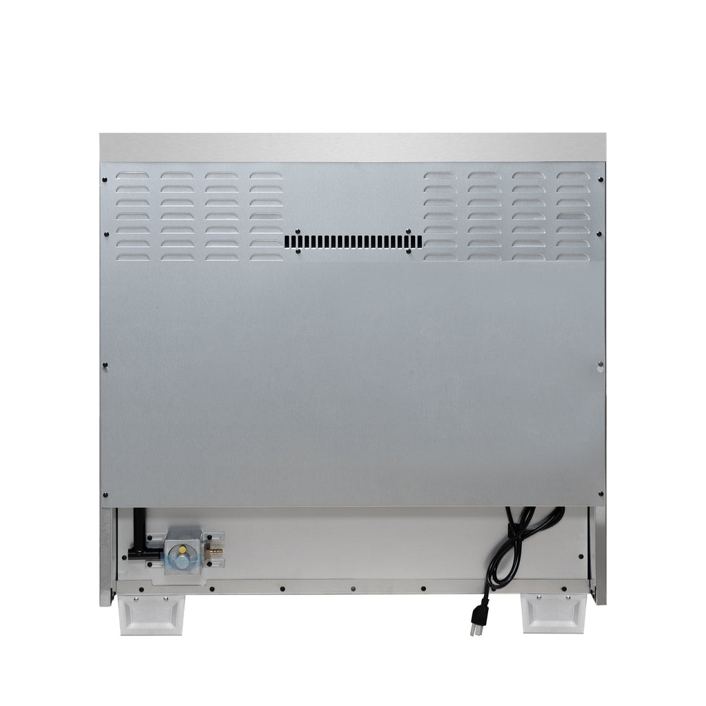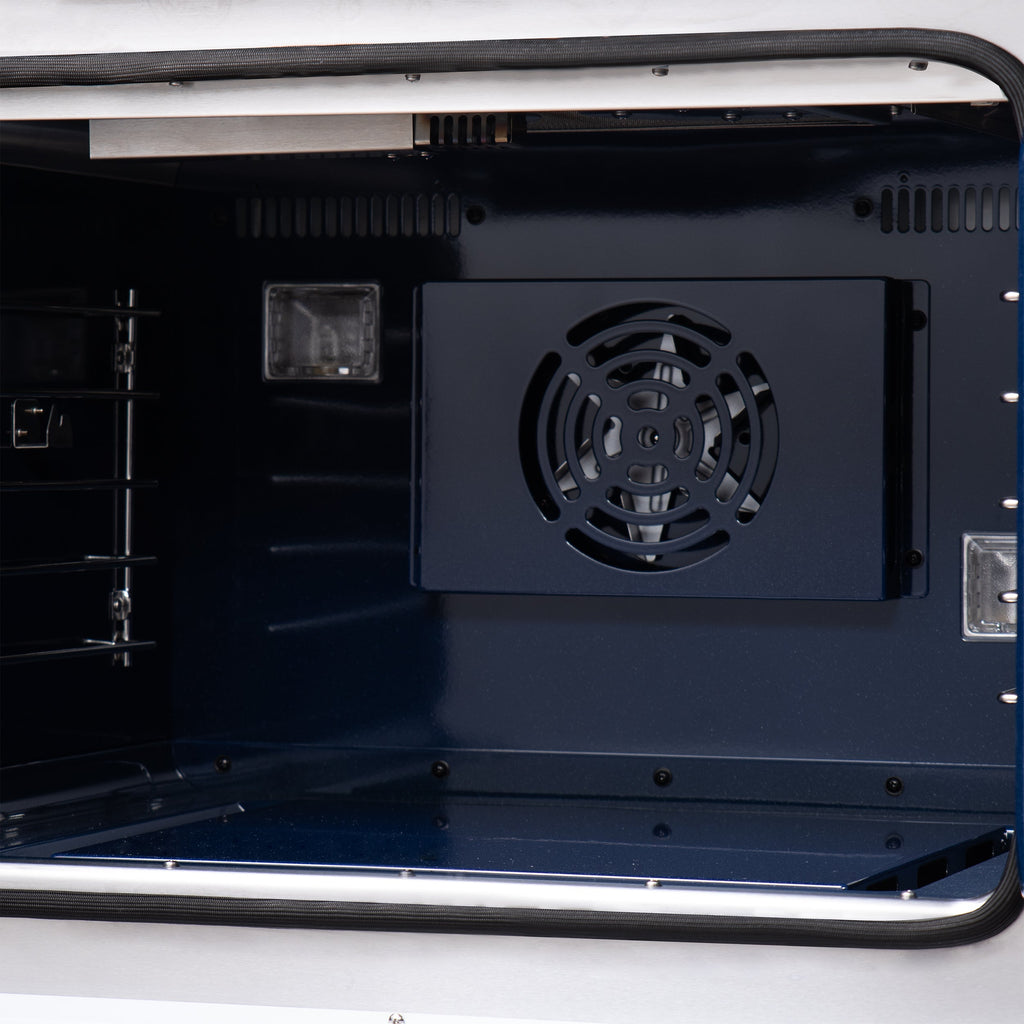 The 36 Inch Forno Capriasca French Door Gas Range in Black elevates your home kitchen with professional style and performance. Its unique French doors provide an extra 12 Inch of access space to the oven. The range top boasts 6 sealed dual-ring brass burners, delivering a total output of 120,000 BTU for precise tasks like simmering or melting chocolate. The heavy-duty continuous cast iron grates ensure stability, covering a recessed enamel cooking surface cavity that contains spills for easy cleaning. The 5.36 cu. ft. gas oven, with a 30,000 BTU output, features a speckled blue enamel interior, convection fan, and a 3-layer glass oven door window for fast and precise cooking. The package includes an LP conversion kit, 3 stainless steel telescopic oven racks, wok support, reversible griddle, rotisserie kit, skewers forks, air fry basket and drip pan. The illuminated zinc-coated metal knobs with bezel rings add a touch of elegance that lasts for years.