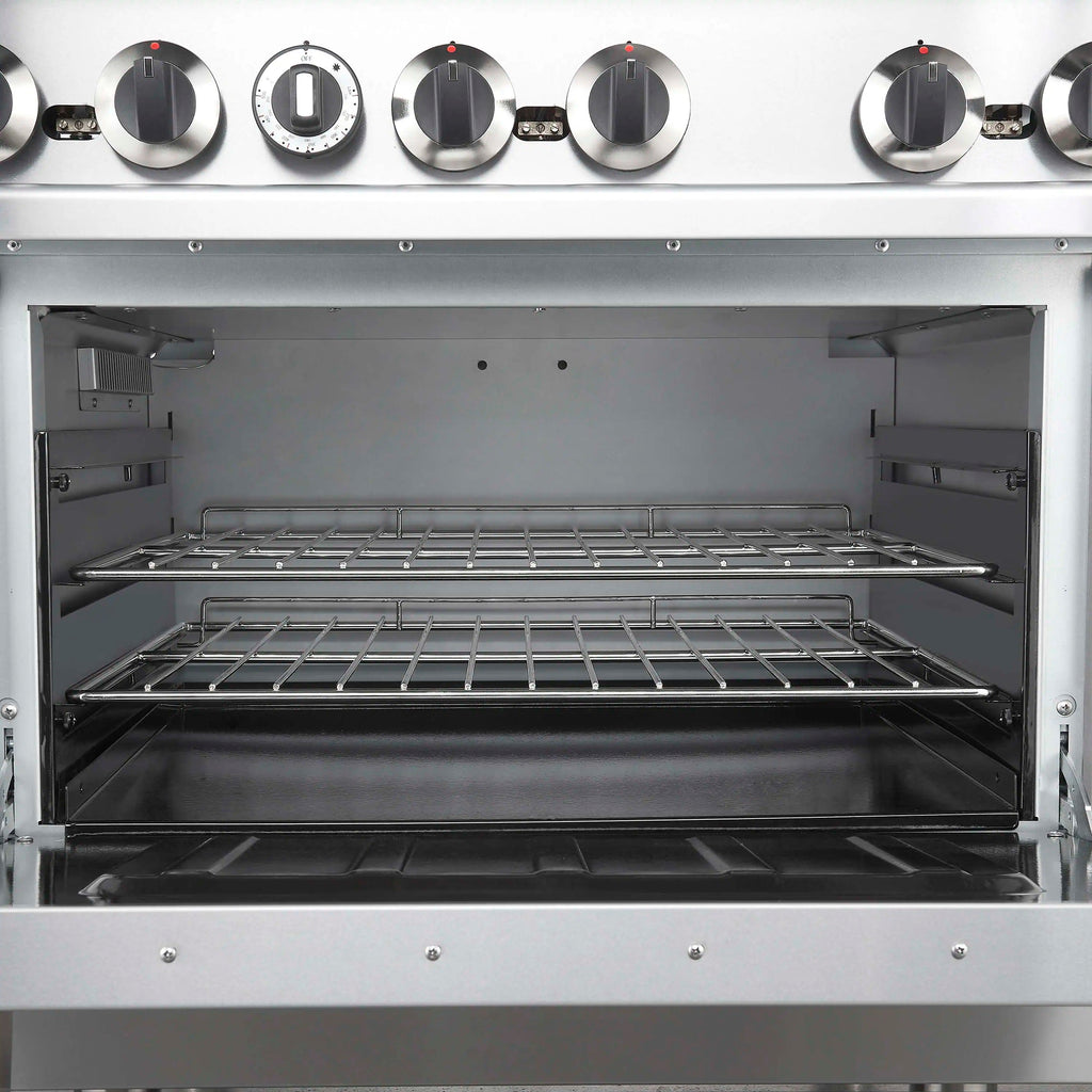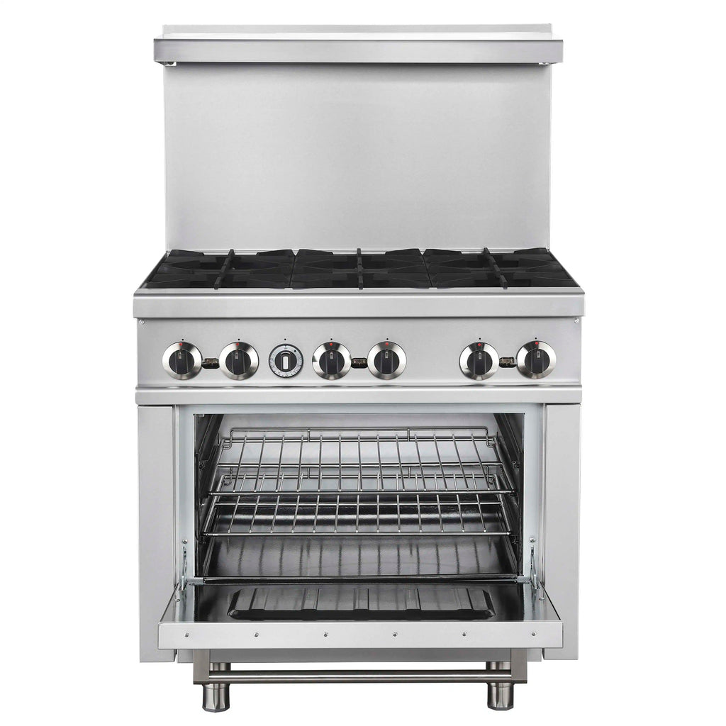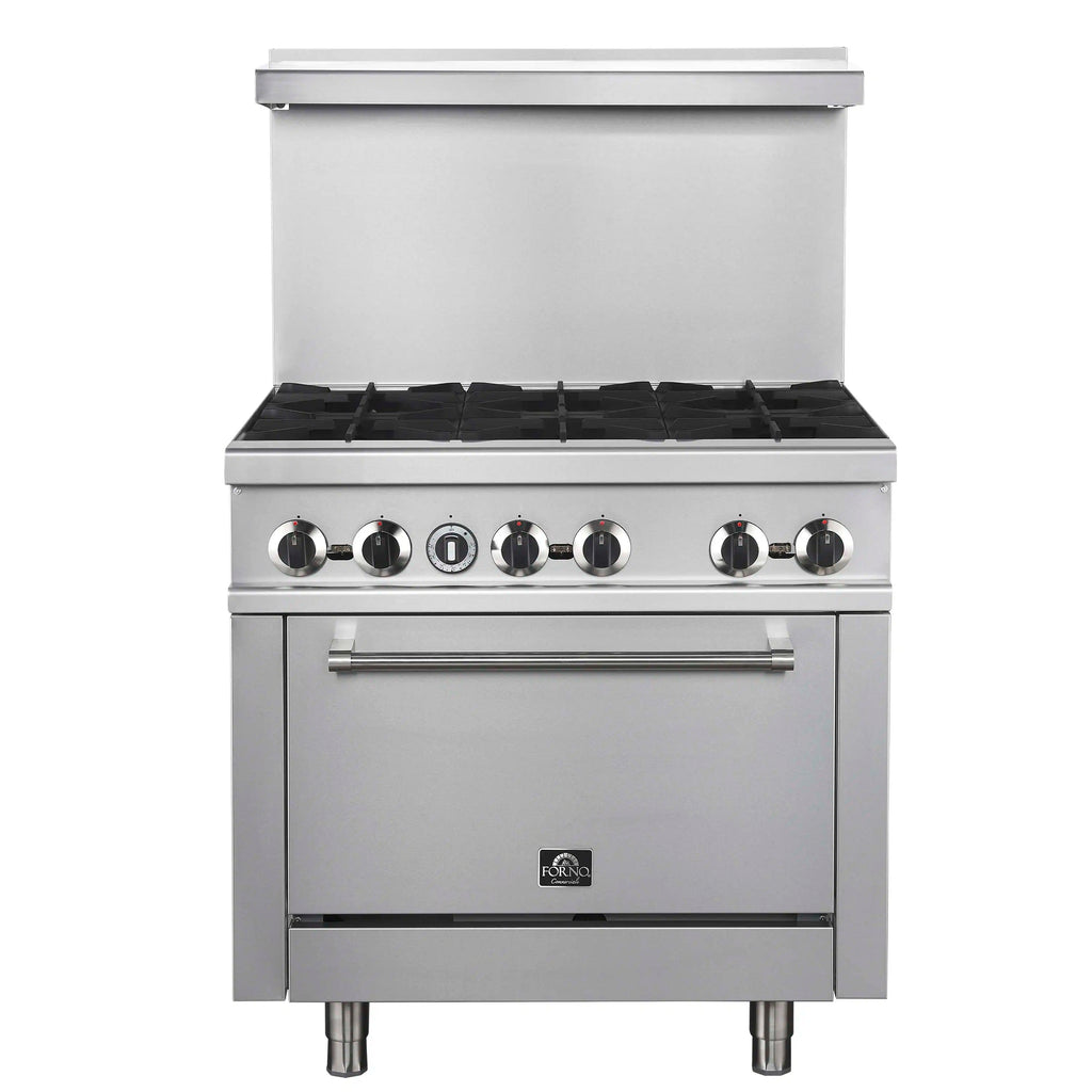 The Forno Commerciale 36 Inch Gas Range with 6 Burners delivers powerful performance and reliability for any commercial kitchen. Its spacious 4.65 cu. ft. oven features an adjustable thermostat ranging from 200°F to 500°F, giving you precise temperature control for a variety of cooking needs. Heavy-duty cast iron grates provide stability and durability, while the porcelain-coated oven bottom allows for easy cleaning after high-volume use. CSA certification ensures dependable safety and performance, making this range a trusted choice for professional cooking environments.