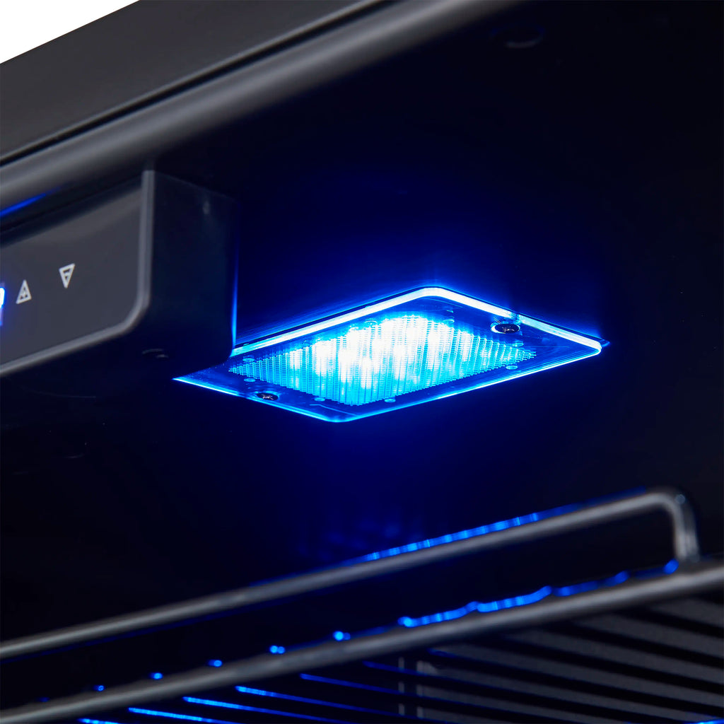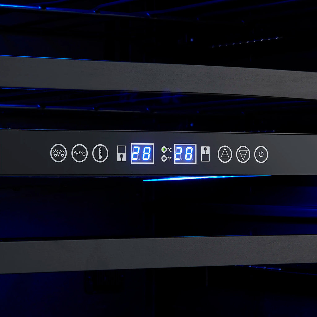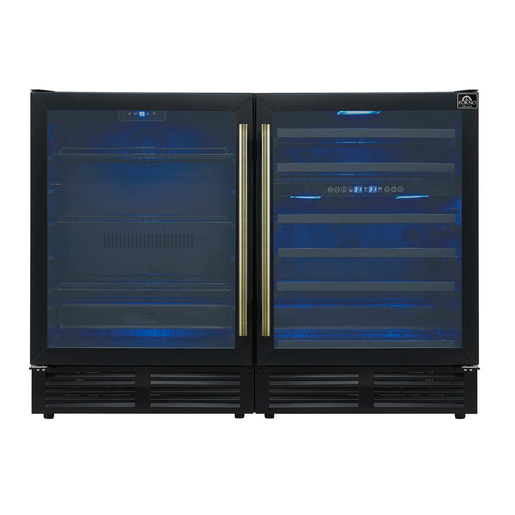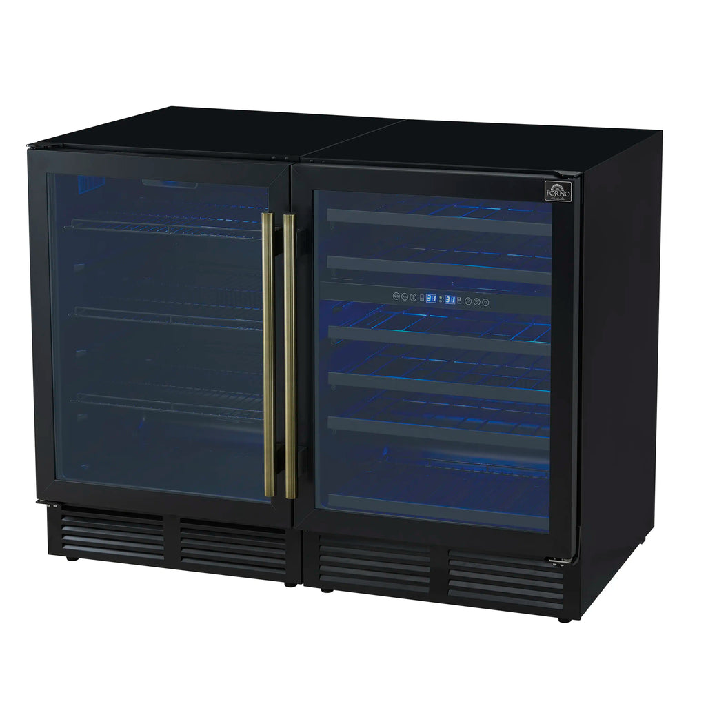 The Forno Gemello Side-by-Side Wine and Beverage Cooler in Black combines modern design with advanced cooling technology for optimal drink storage. Featuring a 9.6 cu. ft. total capacity, it holds up to 188 cans on one side and 51 wine bottles on the other side, allowing you to store beverages, red, and white wines at their ideal serving temperatures. Finished in bold black with elegant antique brass handles, this cooler adds a sophisticated touch to any kitchen or bar area. The black enamel interiors, and anti-UV triple-layer glass, this unit protects your collection from light exposure and maintains consistent humidity. Dual evaporator cooling system and electronic temperature control delivers precise performance, while charcoal filters help preserve wine aroma and quality. With Energy Star certification, automatic frost free defrost, and fingerprint-resistant finishes, the Gemello is designed for convenience and long-term durability. Glide-out racks, reversible doors, and leveling legs make installation easy in both freestanding and undercounter setups.