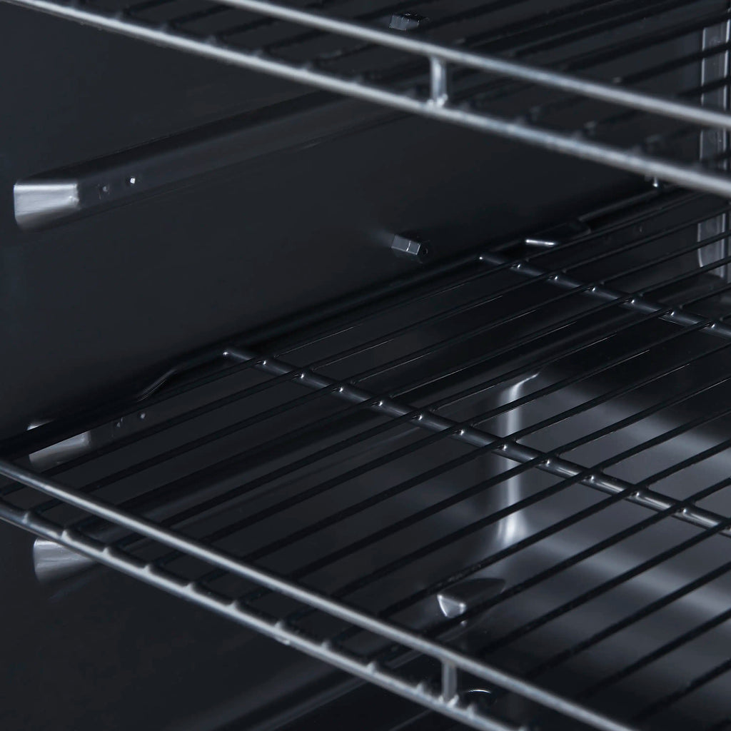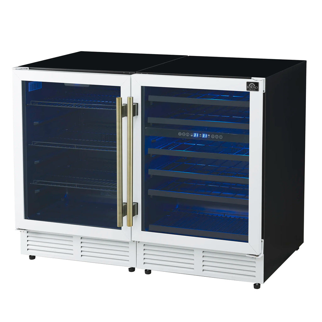 The Forno Gemello Side-by-Side Wine and Beverage Cooler in White combines modern design with advanced cooling technology for optimal drink storage. Featuring a 9.6 cu. ft. total capacity, it holds up to 188 cans on one side and 51 wine bottles on the other side, allowing you to store beverages, red, and white wines at their ideal serving temperatures. Finished in crisp white with elegant antique brass handles, this cooler adds a sophisticated touch to any kitchen or bar area. The black enamel interiors, and anti-UV triple-layer glass, this unit protects your collection from light exposure and maintains consistent humidity. Dual evaporator cooling system and electronic temperature control delivers precise performance, while charcoal filters help preserve wine aroma and quality. With Energy Star certification, automatic frost free defrost, and fingerprint-resistant finishes, the Gemello is designed for convenience and long-term durability. Glide-out racks, reversible doors, and leveling legs make installation easy in both freestanding and undercounter setups.