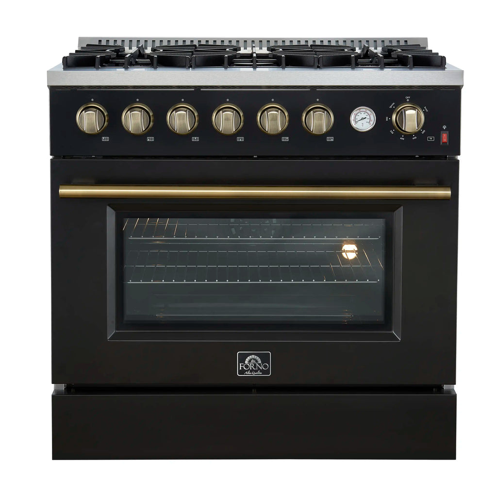 Make a statement with the Forno Marco 36 Inch Gas Range in sleek black and antique brass. This premium appliance features 6 sealed burners with 67,000 BTU output, catering to every cooking need, from gentle simmering to intense searing. The 5.36 cu.ft. convection oven ensures precision and even cooking for large roasts, casseroles, or baked goods. Designed for convenience, it includes durable oven racks and features a hidden bake burner for effortless cleanup. The bold design, coupled with outstanding performance, makes this range a standout addition to your kitchen. Lower the cost of living with Forno.