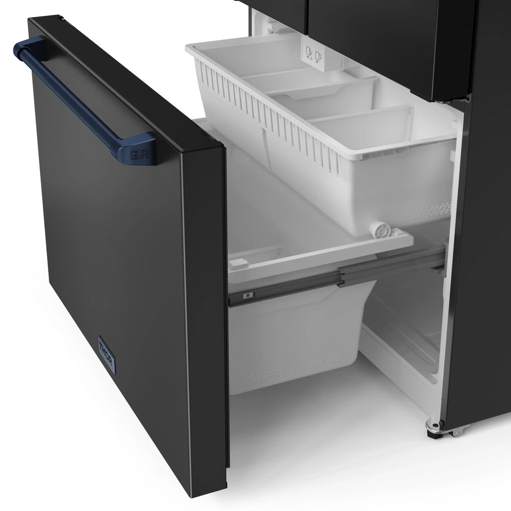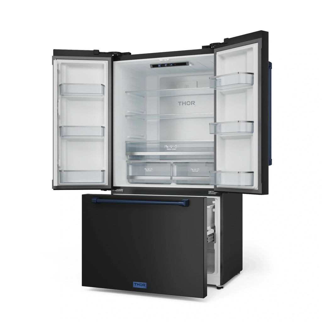 Experience superior freshness with the 36 Inch 20.3 cu ft French Door Counter Depth Refrigerator in Black/Navy Blue. With advanced cooling technology, spacious interiors, and customizable features, this refrigerator ensures your ingredients stay at peak freshness. Designed for durability and efficiency, it brings top-tier performance and style to your kitchen.