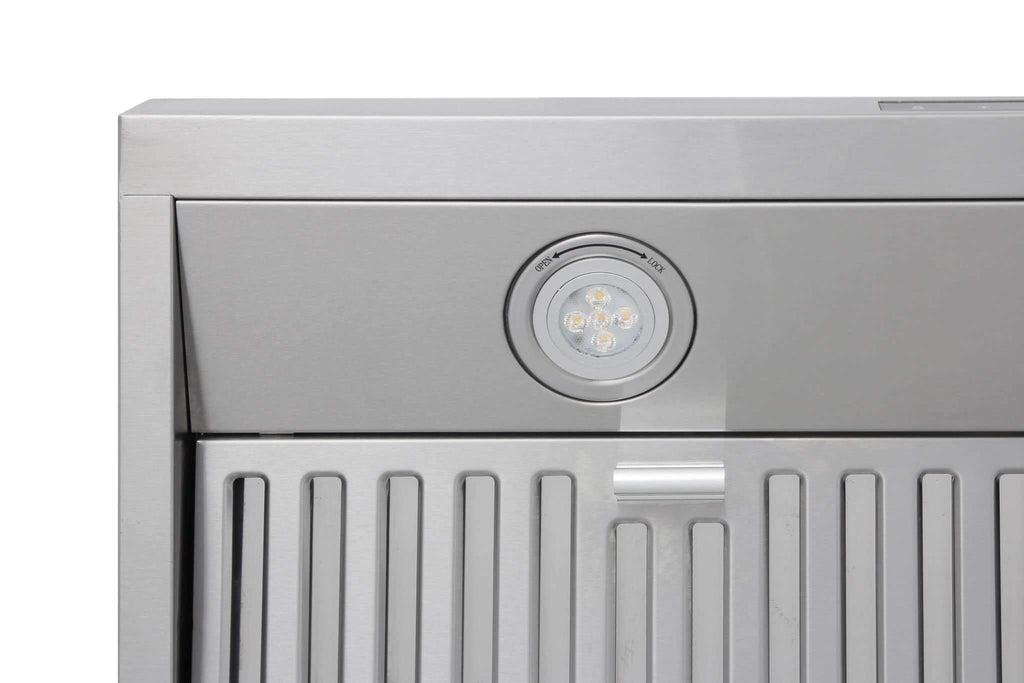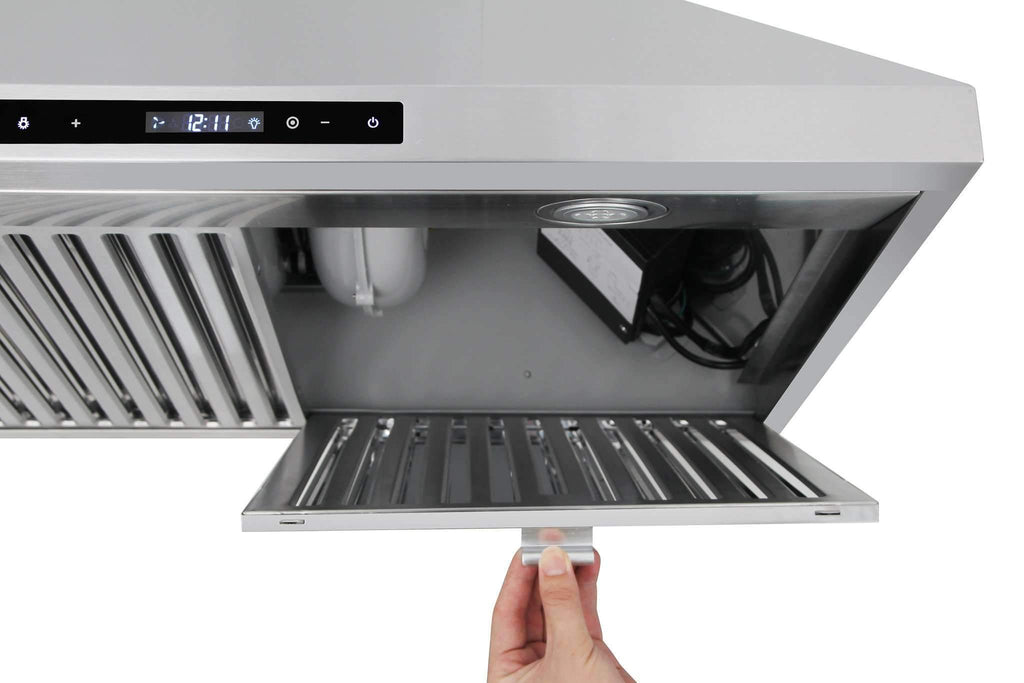 COMMERCIAL-STYLE BAFFLE FILTER - Large, commercial-style 430 grade stainless steel baffle filter maximizes air flow and grease filtering while the hood is in operation