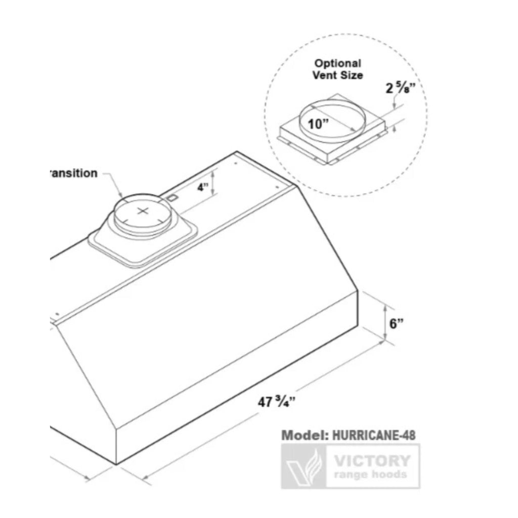 Experience powerful ventilation with the Victory Hurricane-36 Under Cabinet Range Hood. Featuring a top exhaust design, ultra-quiet 1200 CFM blower, and durable all-metal impellers backed by a lifetime warranty. Mechanical controls and dishwasher-safe stainless steel baffle filters make it a reliable, low-maintenance solution for any kitchen.
